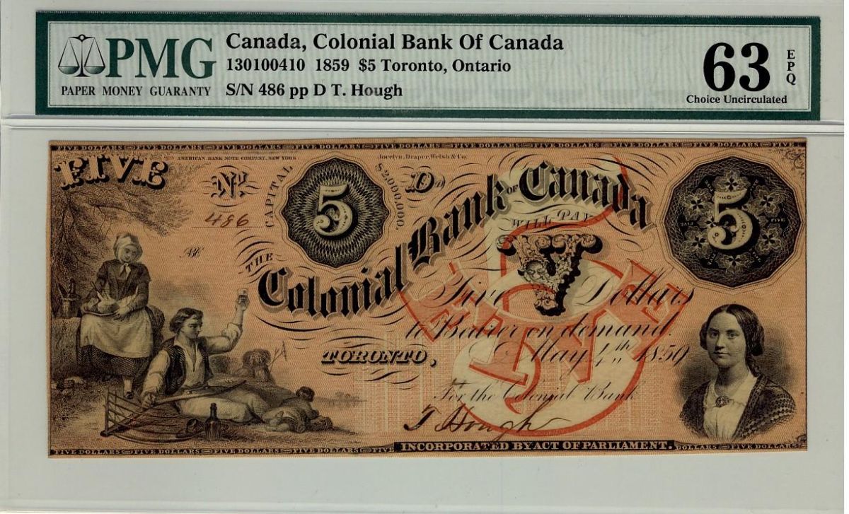 The Colonial Bank of Canada 1859 $5 #486 CH-130-10-04-10, PMG CH UNC63 EPQ.