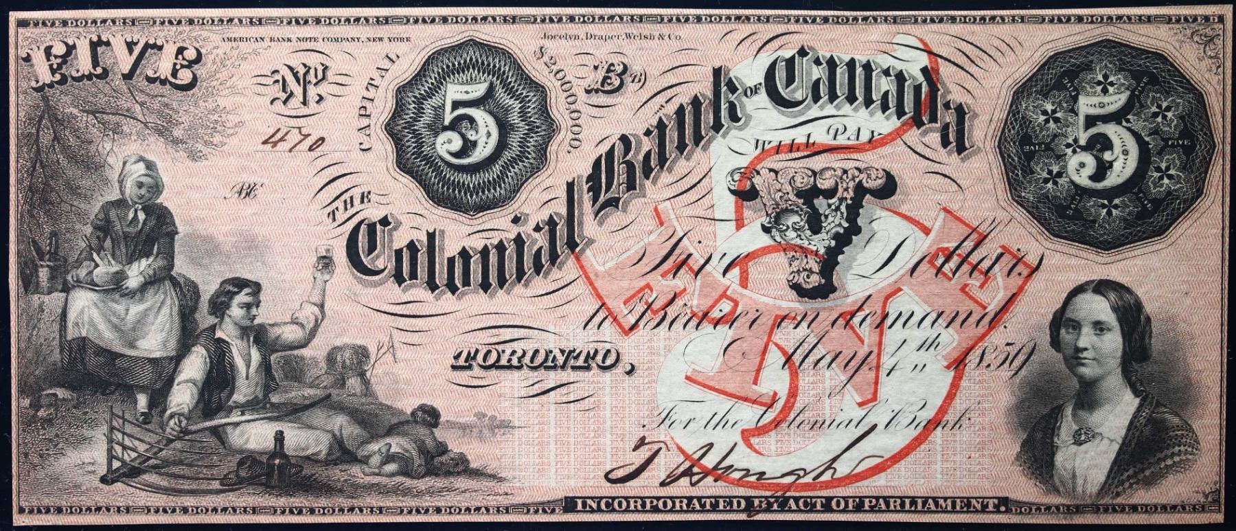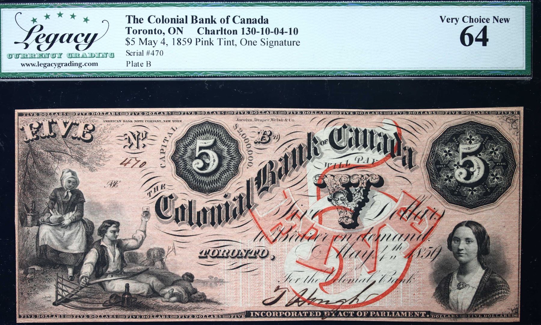 The Colonial Bank of Canada 1859 $5 CH-130-10-04-10 #470 LCG Choice Uncirculated-64
