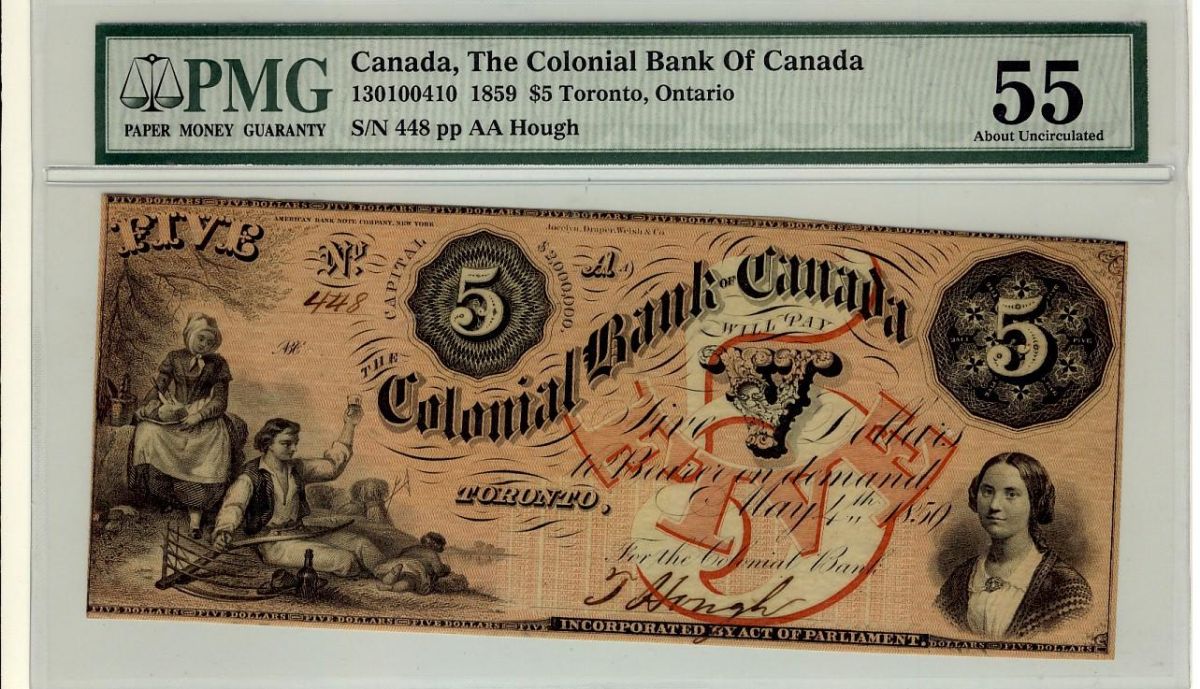 The Colonial Bank of Canada, 1859 $5 CH-130-10-04-10. PMG AU