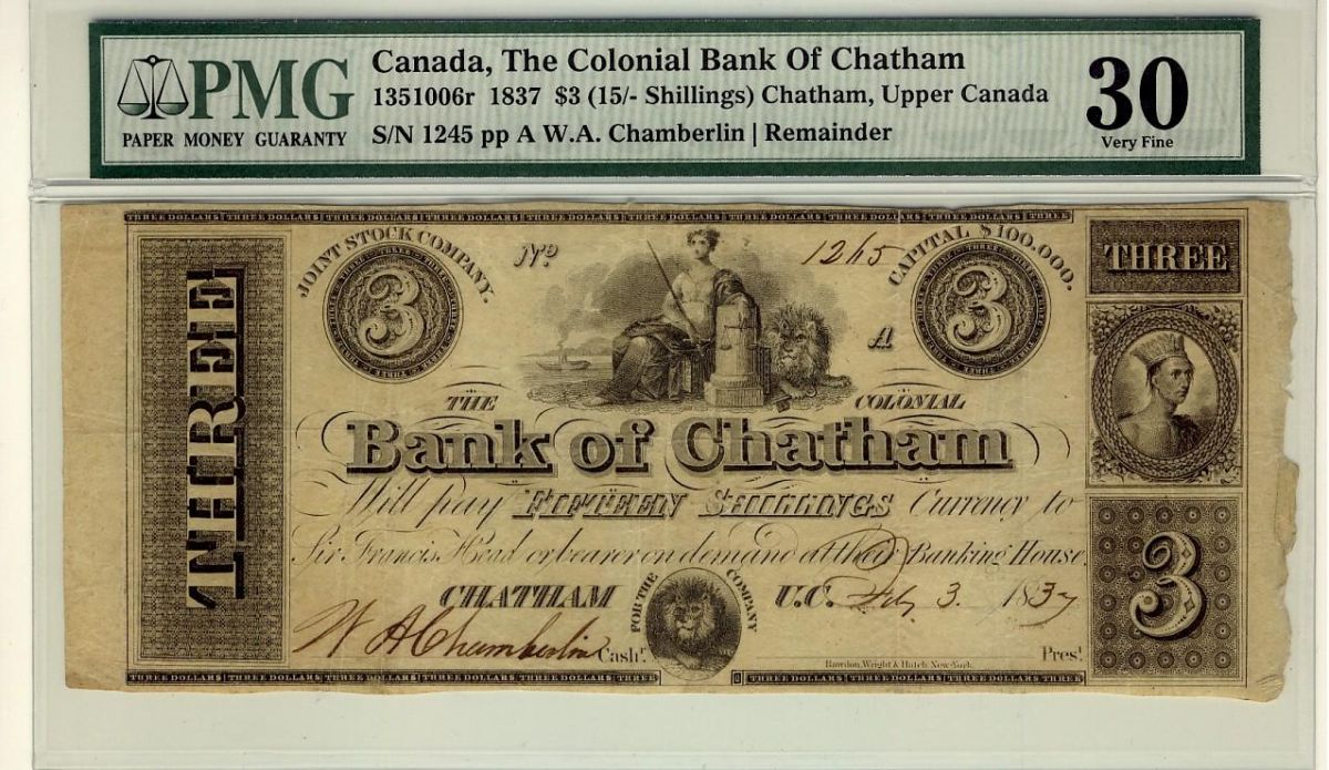 The Colonial Bank of Chatham, 1837 $3 CH-135-10-06. PMG VF30. RARE and unlisted in this grade.