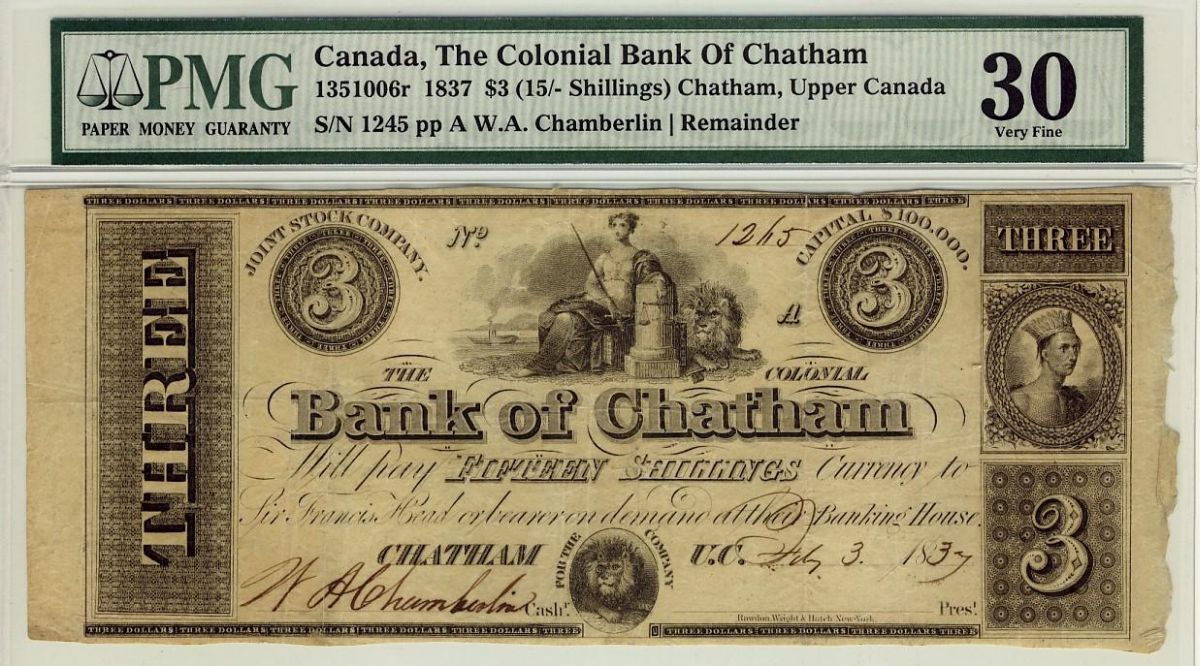 The Colonial Bank of Chatham, 1837 $3 CH-135-10-06. PMG VF30. RARE and unlisted in this grade.