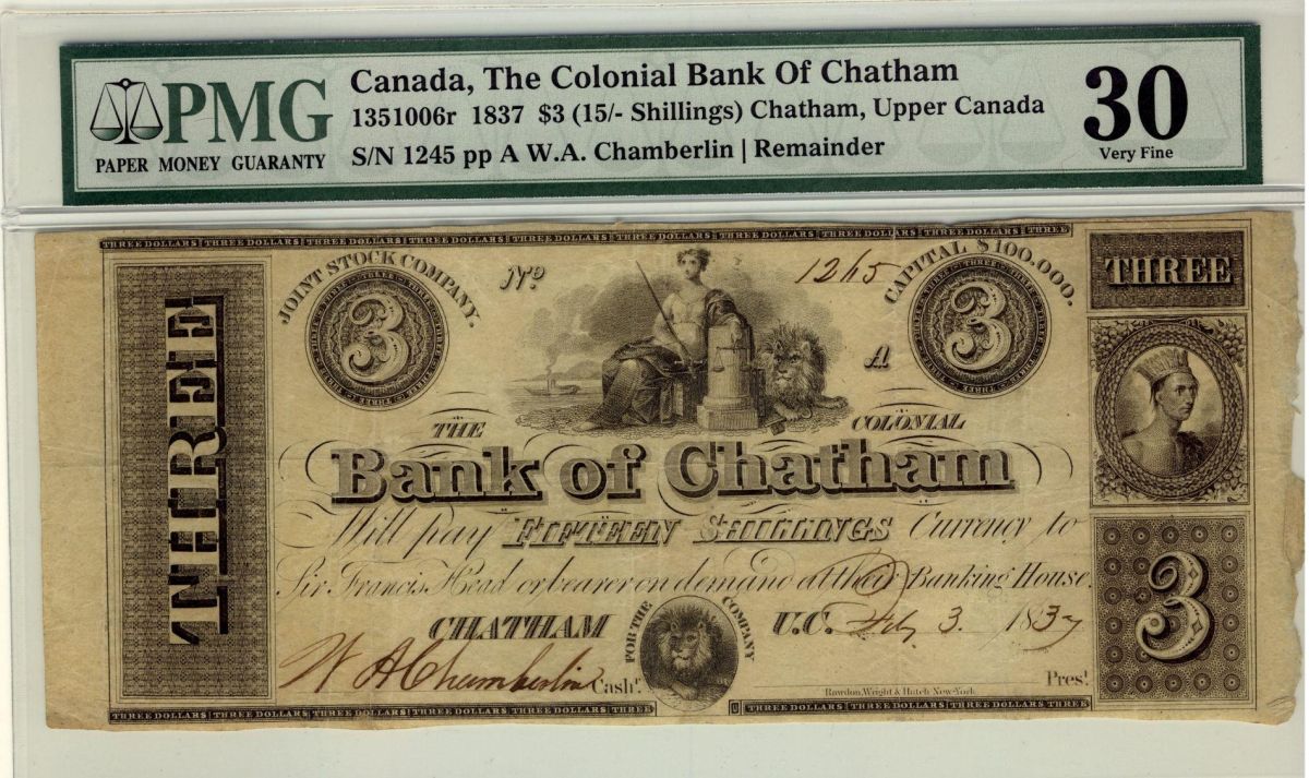 The Colonial Bank of Chatham, 1837 $3 CH-135-10-06. PMG VF30. RARE and unlisted in this grade.