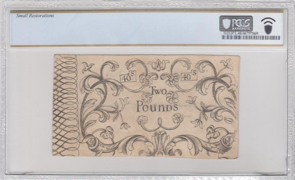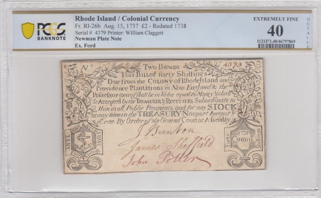 The Colony of Rhode Island and Providence Plantations in New England. Newport. August 15, 1737, Redated 1738. Two Pounds or Forty Shillings. Fr. RI-26b. PCGS Extremely Fine-40 Details. Small Restorations. As illustrated.