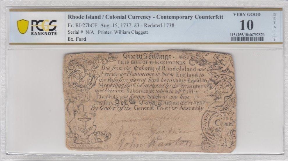 The Colony of Rhode Island and Providence Plantations in New England. Newport. August 15, 1737, Redated 1738. Three Pounds or Sixty Shillings. Fr. RI-27bCF. PCGS Very Good-10 Details. Multiple Repairs, Pieces Added. As illustrated.