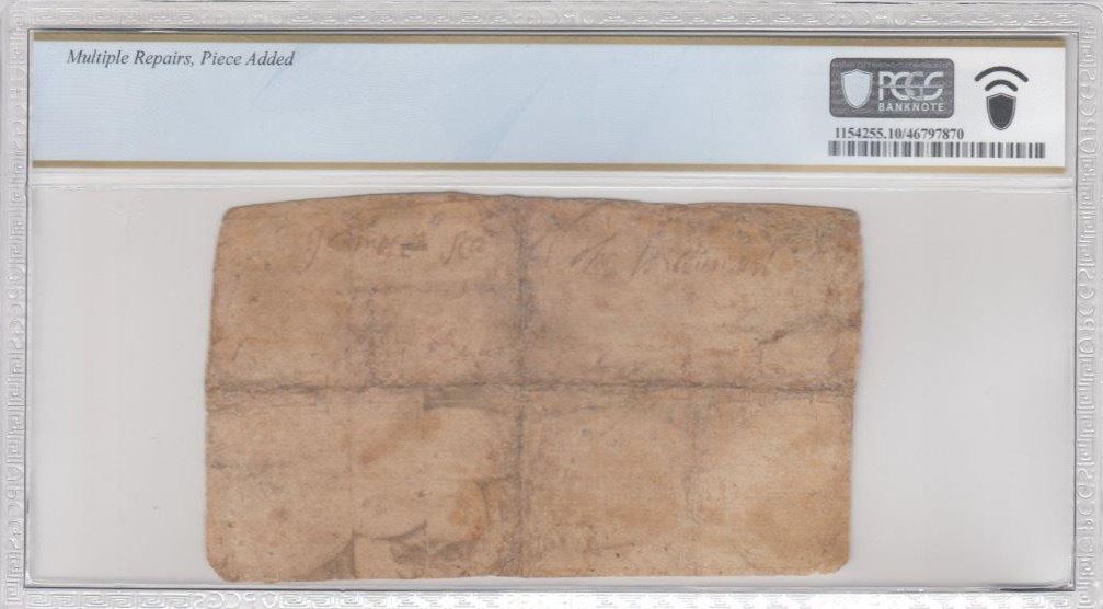 Description: Laid paper. Serial number illegible. Signed by James Sheffield, John Gardner, and John Wanton. Printed by William Claggett. Two-Sided, only a faint trace of the back vignette is visible. 120mm by 70mm. Another somewhat controversial note from “Little Rhody.” Considered a period counterfeit by Neman, and then considered genuine by Ford. Now, PCGS holds the latest hand for that call; the note is now back in the counterfeit realm. It is a moot point no matter which side of the controversy you favor. This well-circulated note saw a near-lifetime of circulation, genuine or otherwise, suggesting it fooled all the people, all the time. Still, it is a piece that fares far better in-hand than in the eyes of PCGS. The paper is medium tan in hue, the ink is strong for the grade, save for the back, as noted earlier. There are very few numismatists who would turn down an opportunity to obtain an extremely rare coin because of a few minor blemishes or faults. Colonial paper specialists also know that rule of thumb by heart: go for it now, or go without it for who can say how long.