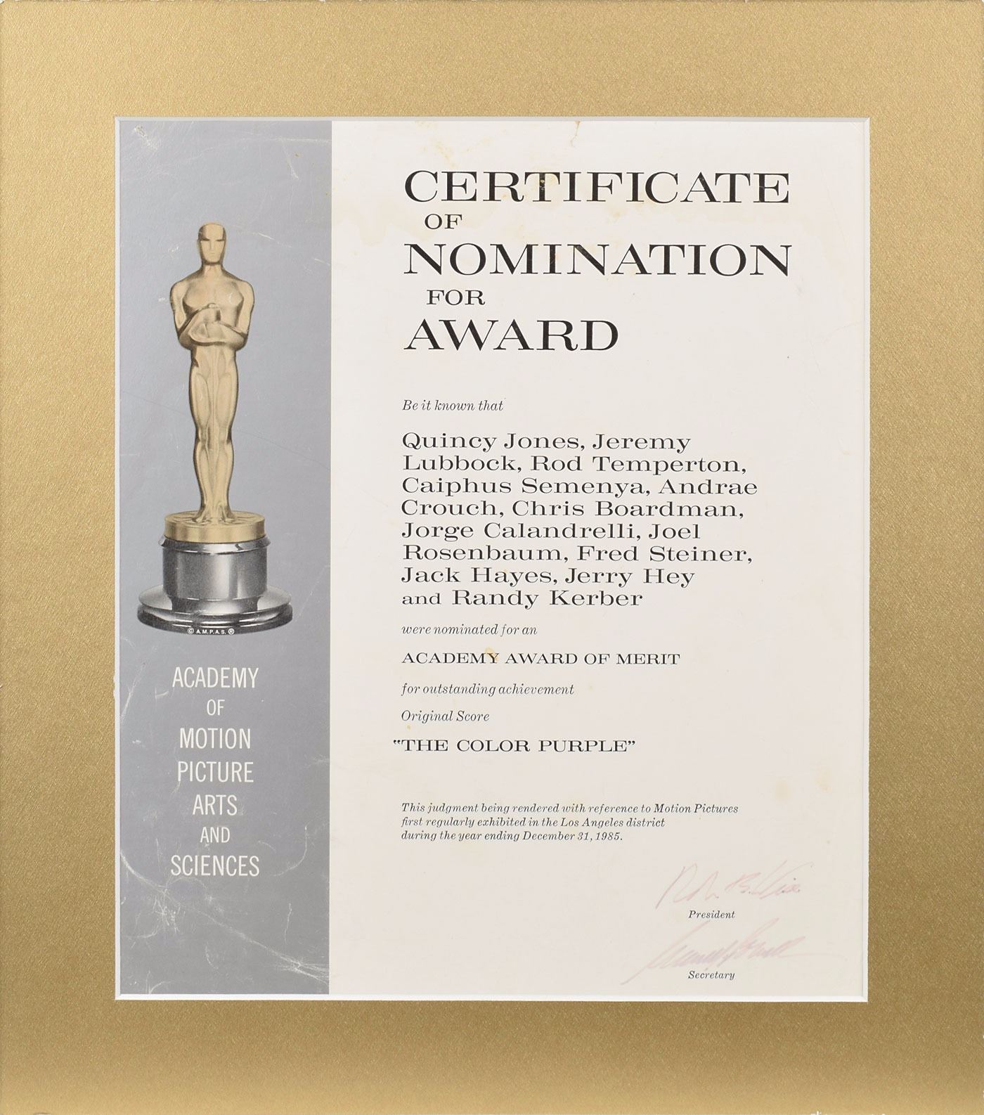 Academy of Motion Picture Arts and Sciences certificate of nomination for Best Original Score, 9.25 x 10.75, in full: "Certificate of Nomination for Award. Be it known that Quincy Jones, Jeremy Lubbock, Rod Temperton, Caiphus Semenya, Andrae Crouch, Chris Boardman, Jorge Calandrelli, Joel Rosenbaum, Fred Steiner, Jack Hayes, Jerry Hey and Randy Kerber were nominated for an Academy Award of Merit for outstanding achievement, Original Score, 'The Color Purple.' This judgment being rendered with reference to Motion Pictures first regularly exhibited in the Los Angeles district during the year ending December 31, 1985." Signed at the conclusion by Oscar-winning director Robert Wise, who was then serving as president of the Academy, as well as a secretary. Matted to an overall size of 12 x 14. In very good to fine condition, with scattered creasing and a couple small edge tears. Accompanied by a panoramic color 'class photo' from the traditional Oscar nominee luncheon, with two stars of The Color Purple—Whoopi Goldberg and Oprah Winfrey—seen on the left. Based on the Pulitzer Prize–winning novel by Alice Walker, The Color Purple was nominated for eleven Oscars.