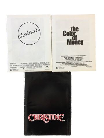 Collection of 3 press kits with black and white publicity stills included, sized mainly 8x10's, from Columbia Pictures and Touchstone Pictures (1980's). From Touchstone Pictures "The Color of Money" (1986) Paul Newman one the Oscar for Best Actor for his role in this film, starring Tom Cruise as Vincent, Paul Newman as Fast Eddie, and Mary Elizabeth Mastrantonia as Carman, 1 still included. From Columbia Pictures "Cocktail" (1988) starring Tom Cruise as Brian Flannigan, Elizabeth Shue as Jordan Mooney, and Bryan Brown as Doug Coughlin, includes 1 still. From Columbia Pictures "Christine" (1983) the horror film of the 80's, starring Keith Gordon as Arnie, Alexandra Paul as Leigh Cabot, and John Stockwell as Dennis Guilder, includes 11 stills.