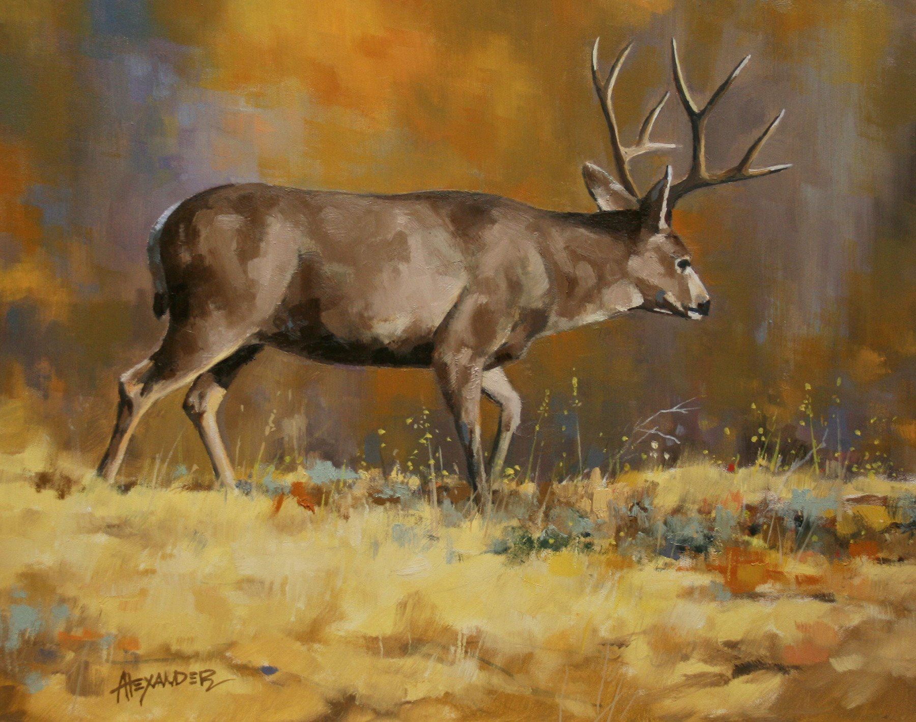 Artist: Colin Alexander. Title: The Colors Of Autumn. Artwork size: 11" x 14". Frame: unframed. Medium: Oil. Artist's description: When I encountered this Mule deer buck during the rut it appeared as though he, judging by his body posture, was on the trail of some does. I felt this and the fall foliage made it a perfect scene to paint.