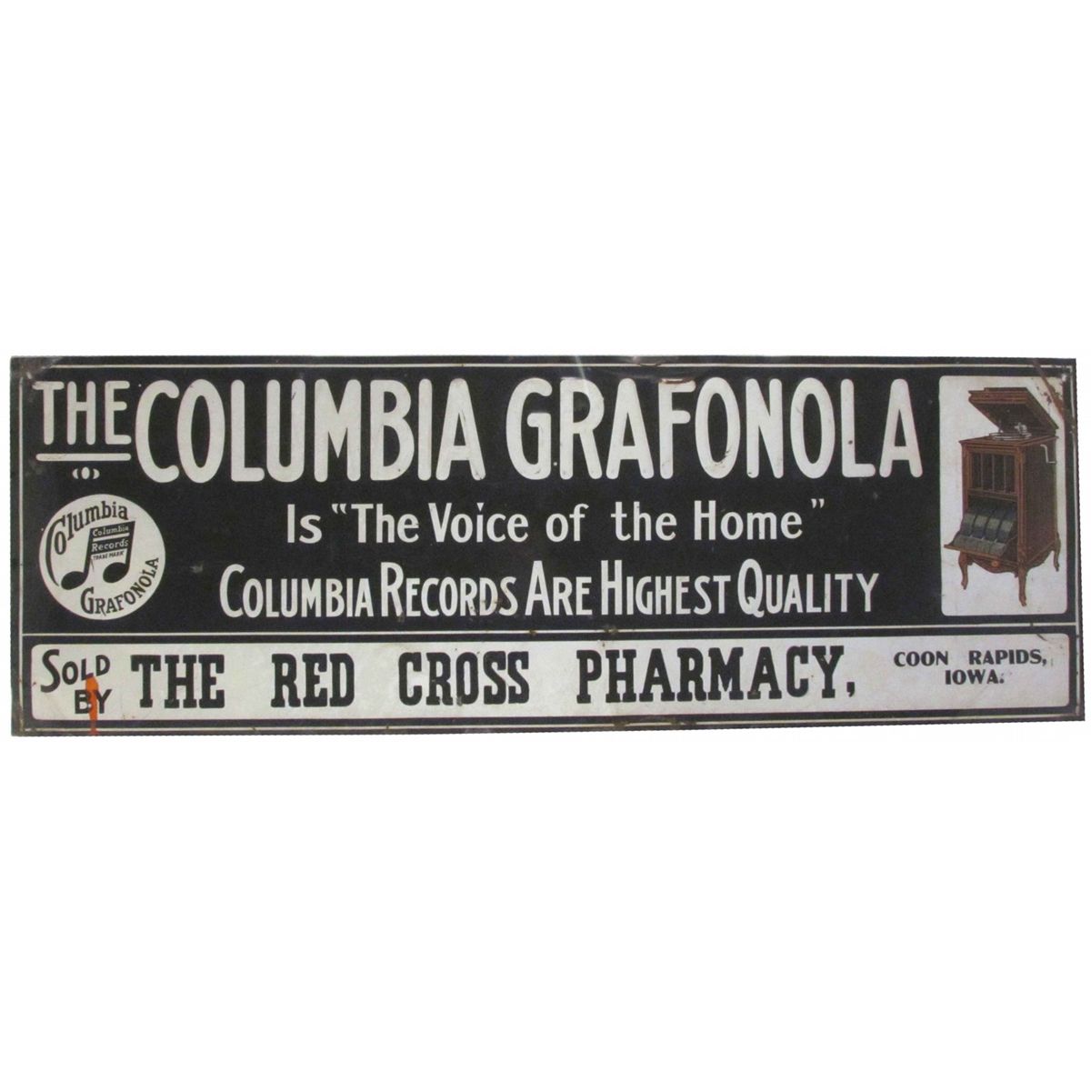 The Columbia Grafonola Embossed Tin Sign. Wrinkles, creases and slight rust otherwise good condition. 27 1/2 X 9 1/2 inches.