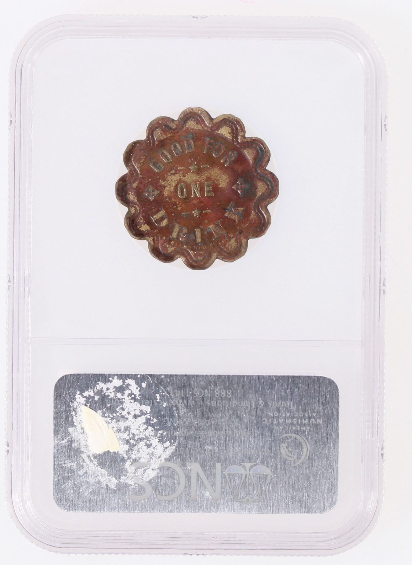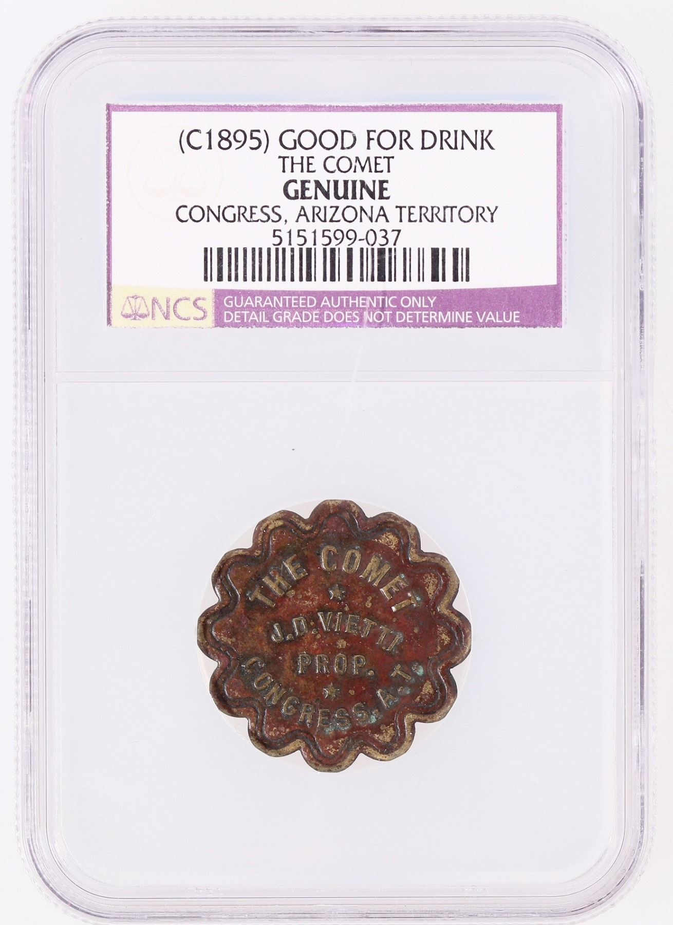 Rare territorial token: THE COMET / J.D. VIETTI / PROP. / CONGRESS, A.T. // GOOD FOR / ONE / DRINK / C.A. KLINKNER & CO. S.F.; Br.., Sc 12, 27 mm. Spooner says R 8.