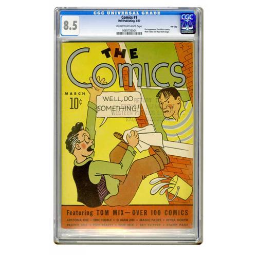 <B>The Comics #1 File Copy (Dell, 1937) CGC VF+ 8.5 Cream to off-white pages.</B></I> The new medium of "comic books" was really taking off, so Dell followed up <B>Popular Comics</B></I> and <B>The Funnies</B></I> with this third anthology series reprinting popular newspaper strips of the day. Tom Mix made his first comic book appearance here. Overstreet 2005 VF 8.0 value = $1,106; VF/NM 9.0 value = $1,703. CGC census 11/05: 1 in 8.5, 1 higher.