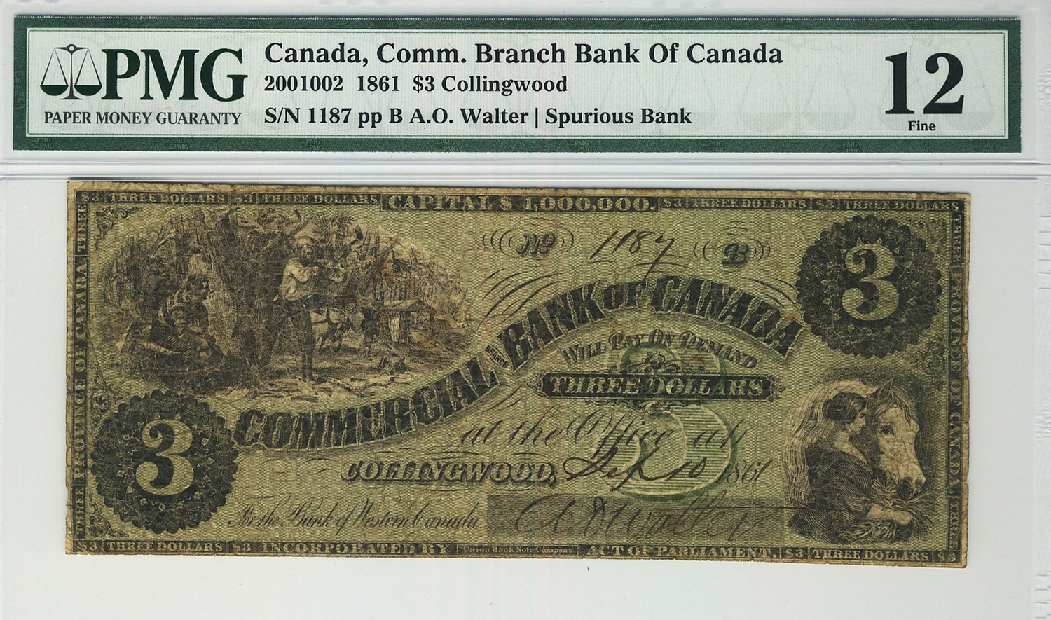 The Commercial Bank of Canada 1861 $3 1187 CH-200-10-02 PMG F12