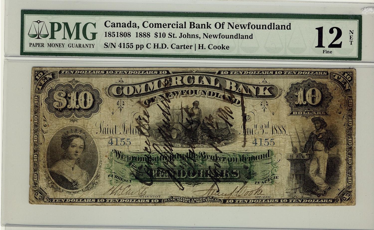 The Commercial Bank of Newfoundland, 1888 $10 #4155, CH-185-18-08, PMG F12 Net.Rare issue. Designated with internal tear and Pen cancelled.