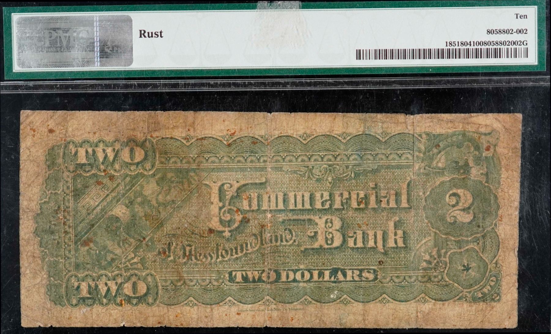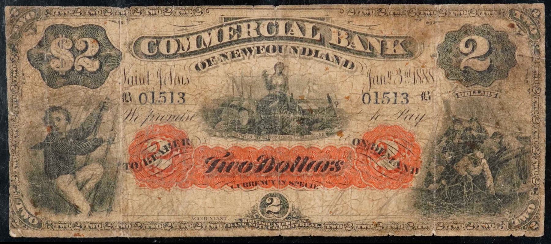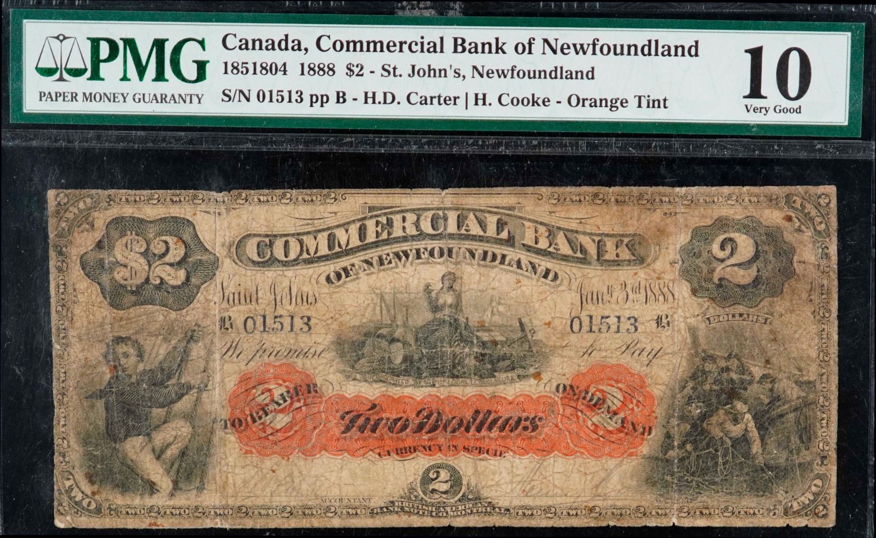 The Commercial Bank of Newfoundland 1888 $2 #01513 "Orange" CH-185-18-04 PMG Very Good-10. Minor rust.
