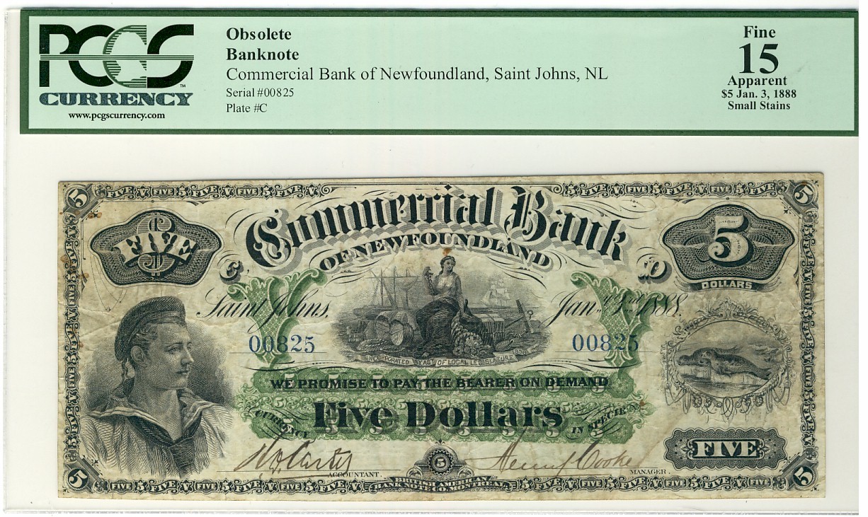 The Commercial Bank of Newfoundland 1888 $5 #00825, PCGS F15. Nice example with a few light stains which does does not hinder the notes appeal.
