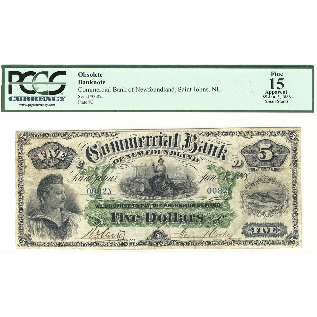 The Commercial Bank of Newfoundland 1888 $5 #00825, PCGS F15. Nice example with a few light stains which does does not hinder the notes appeal.