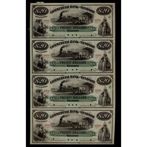 The Commercial Bank of Windsor 186_ $20 CH-195-10-02S. An uncut sheet of four SPECIMEN notes. All notes are AU-UNC. Believed to be the only sheet. Very Rare!
