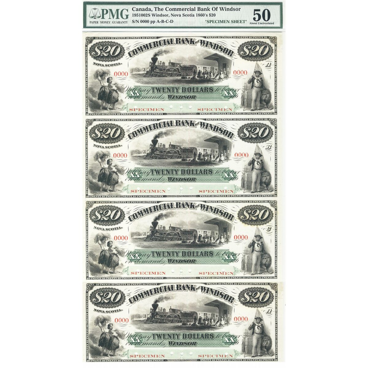The Commercial Bank of Windsor, 1860’s $20 Specimen Sheet CH-195-10-02S. An uncut sheet of 4 notes PMG AU50. Probably unique for type. This attractive green and white sheet was part of the 1990 auction of the ABN Co archives. Should be viewed.