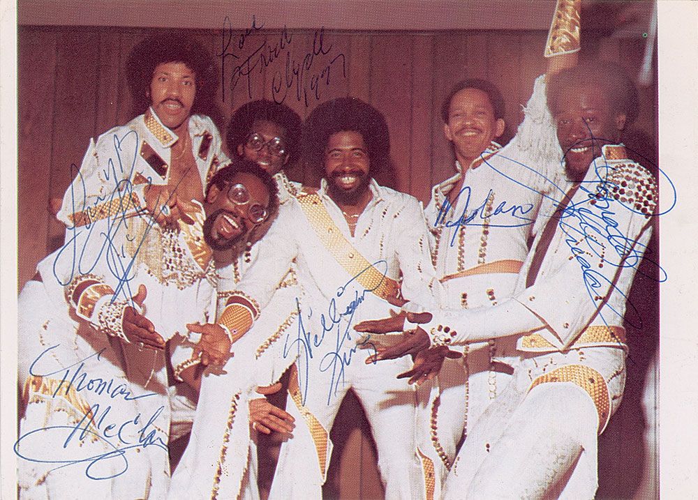 Color 7 x 5 program photo of the group, signed in blue ballpoint by Lionel Richie, Thomas McClary, Walter ‘Clyde’ Orange, William King, Ronald La Pread, and Milan Williams. In fine condition, with lightly trimmed edges.