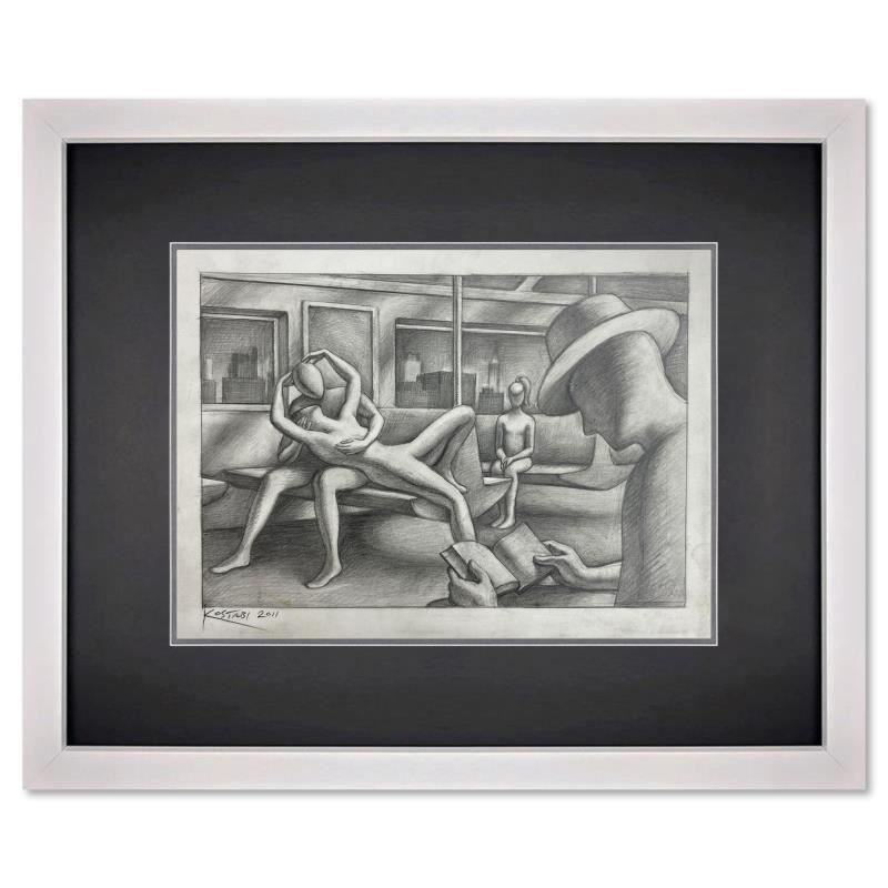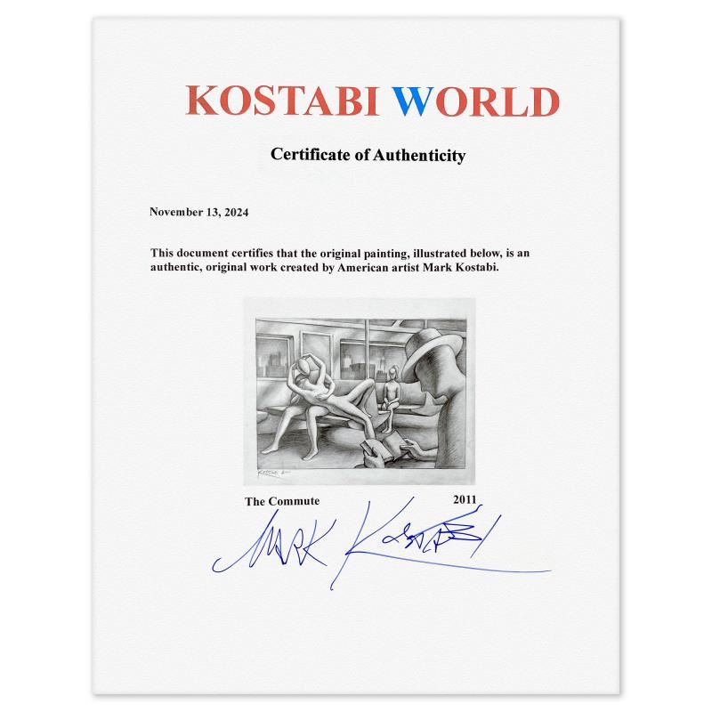 "The Commute - New York" is an original drawing on paper by Mark Kostabi, hand signed by the artist. This piece comes custom framed. Includes Certificate of Authenticity. Measures approx. 18" x 15" (frame), 9" x 12" (image). This item requires special handling and may have a longer than usual turnaround.