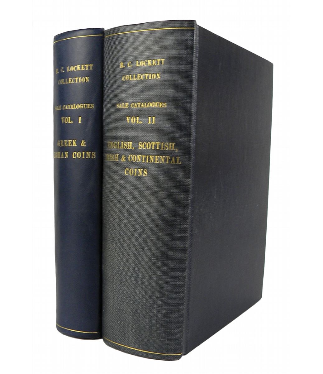 Glendining & Co. CATALOGUE OF THE CELEBRATED COLLECTION OF COINS FORMED BY THE LATE RICHARD CYRIL LOCKETT, ESQ. ENGLISH: PARTS I-V / GREEK: PARTS I-IV / CONTINENTAL / SCOTTISH: PARTS I & II / ROMAN AND BYZANTINE. London, 1955-61. Thirteen parts complete, bound in two volumes. 8vo, contemporary blue and gray cloth, gilt. 1224 pages; frontispiece portrait; 9709 lots; 368 fine collotype plates of coins; prices realized printed in all sales. Near fine. A monumental series of sales, indispensable to collectors and students of English and ancient Greek coins alike. Rarely offered complete, especially priced. Ex P. Malcolm Heinmiller, with his bookplates. Clain-Stefanelli 1971*, 2296*, 3675, 5036, 5364, 6142, 6155 & 11274. Daehn 2047 (Greek I-IV). Grierson 284 & 298. Spring 232-235 (Greek I-IV) [also listed under "Most important sales of ancient Greek coins"].