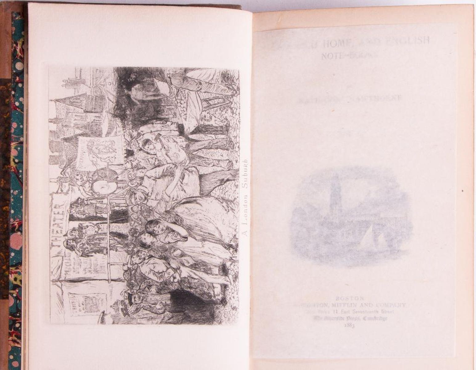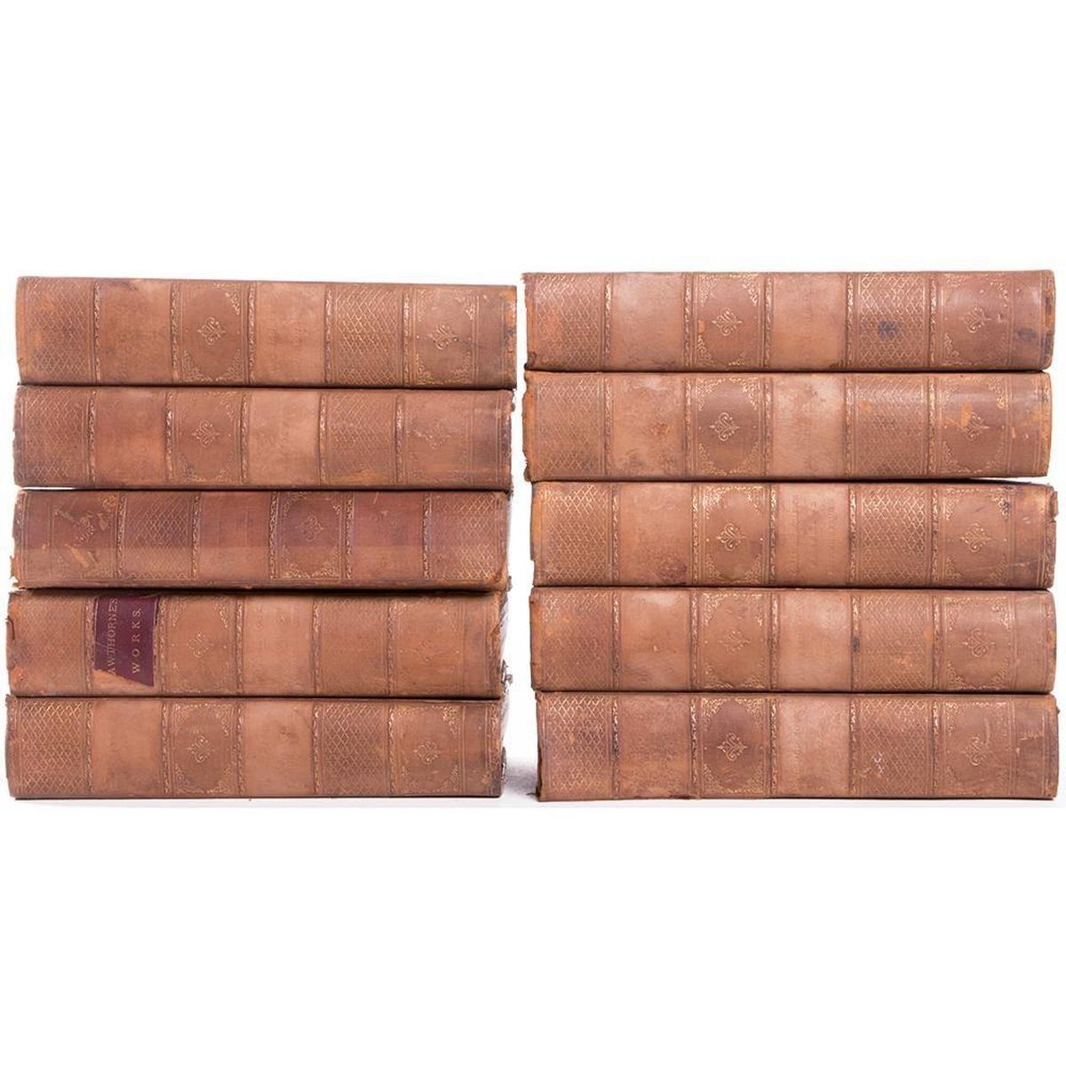 Title: The Complete Works of Nathaniel Hawthorne, With Introductory Notes by George Parsons Lathrop Author: Nathaniel Hawthorne Place: Boston Publisher: Houghton, Mifflin and Company Date: 1883 Description: Ten volumes in three quarter binding, morocco leather and marbled boards. Condition: Fair-Good. Leather worn: bumped, rubbed, and missing pieces. Title leather blocks and volume leather blocks for spine are missing. Faded gilt design on spine. One spine is separating from headband.