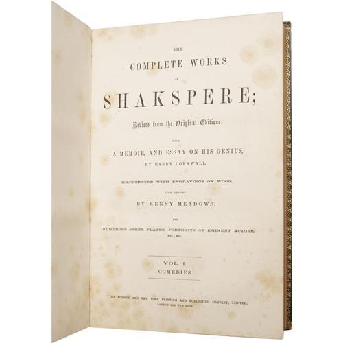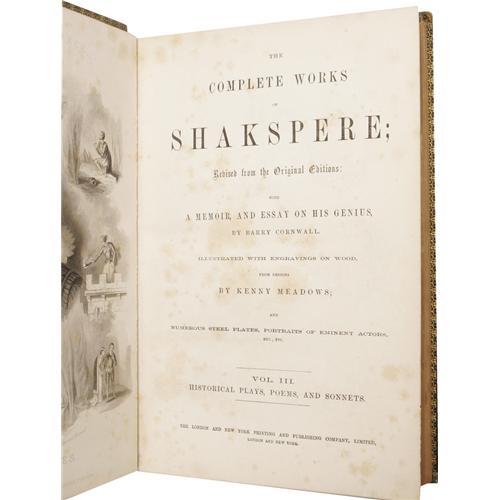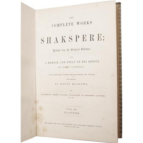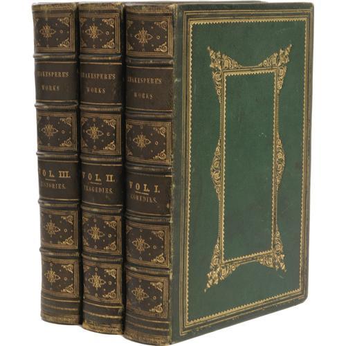 <B><I>The Complete Works of Shakspere</B></I></B></I><I>; Revised from the Original Editions: with a Memoir, and Essay on His Genius by Barry Cornwall. Illustrated With Engravings on Wood, From Designs by Kenny Meadows; and Numerous Steel Plates, Portraits of Eminent Actors, Etc., Etc.</B></I> (London: The London and New York Printing and Publishing Company, Limited, nd), three volumes, 4to (7.5" x 10.75"), green leather binding with gilt decorations and gilt edges, with gilt lettering on banded leather spine, marbled endpapers. Volume I: The Comedies is 573 pages, and has the Bard's name spelled "Shakspere" on the title page, "Shakespere" on the spine, then "Shakespeare" in the body of the text. This volume displays rubbing to the bottom edges and back board, mild shelf wear to the spine, and mild foxing to the first three-quarters of the text. Volume II: Tragedies is 554 pages. This volume is good, with some general edge wear, especially to the bottom edge, bumped corners, mild foxing to the beginning and ending of the text, and the spine and front board have come detached at the front hinge. Volume III: Historical Plays, Poems, and Sonnets is 590 pages, followed by a 16-page glossary. The book is good, with rubbed and nicked edges, scratched boards, bumped corners, and mild spine wear. Very mild foxing to the beginning of the text. Though this set is mildly shelf-worn, the text is bright and clean, and the illustrations alone make this an attractive addition to any Shakespearean's library. <I>From the Betty Bennett Collection.</B></I><BR><BR><b>Shipping:</b> Books & Catalogs (<a target="_blank" href="http://www.heritageauctions.com/common/shipping.php">view shipping information</a>)