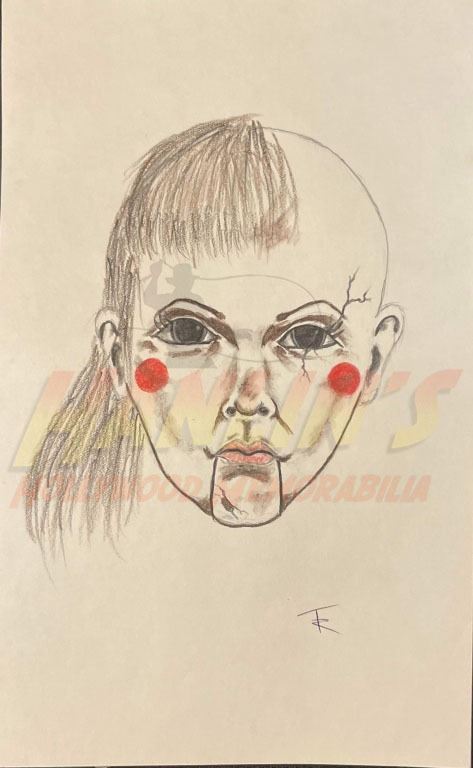 Original hand drawn concept artwork of the creepy doll 'Annabelle' used in development to see what the doll would look like in pre-production of the James Wan directed supernatural horror film 'Annabelle' (2014), the inaugural film in The Conjuring Universe franchise.