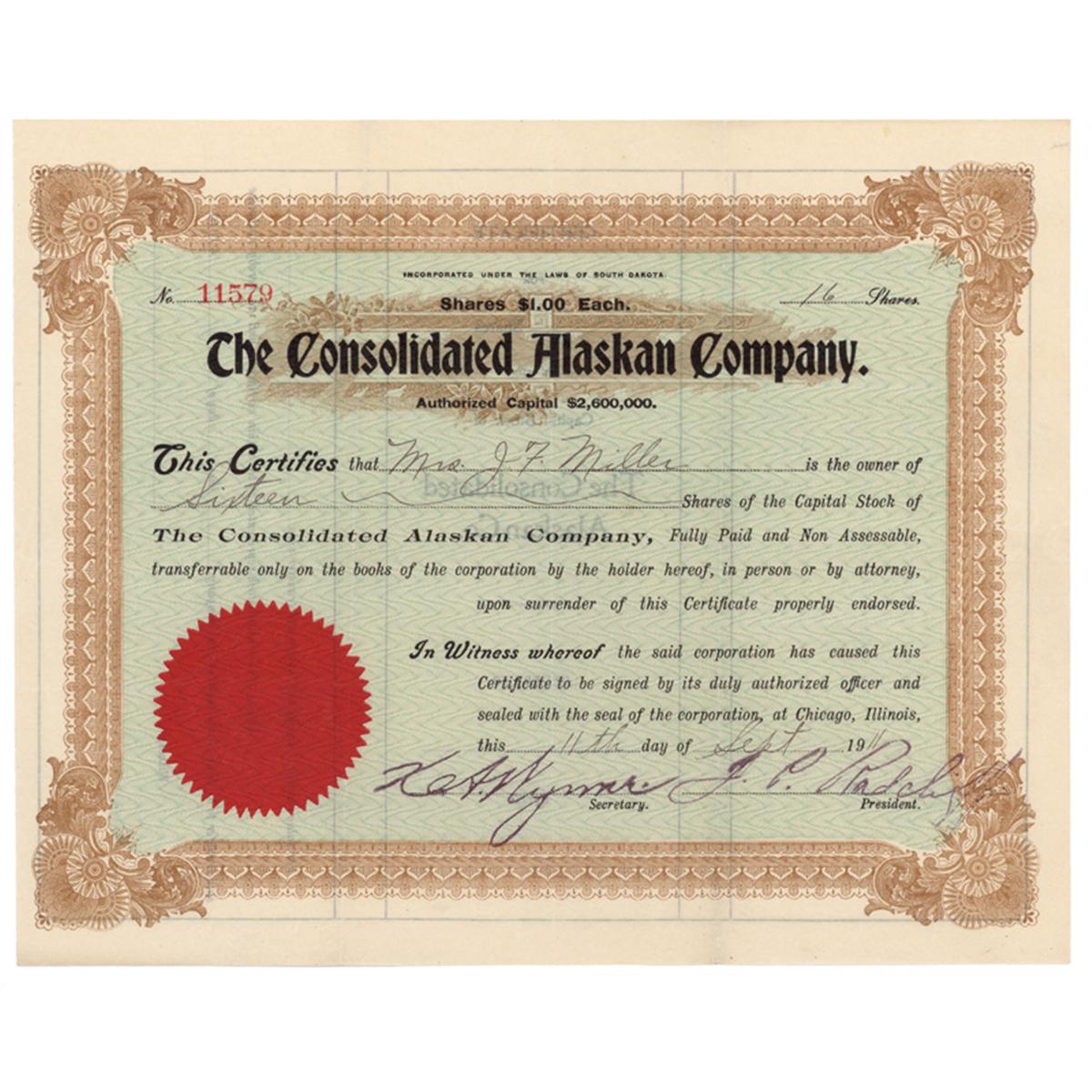1911, South Dakota. Stock certificate for 16 shares. Brown/Black with light green background and attached embossed red company seal. Uncancelled and fine.