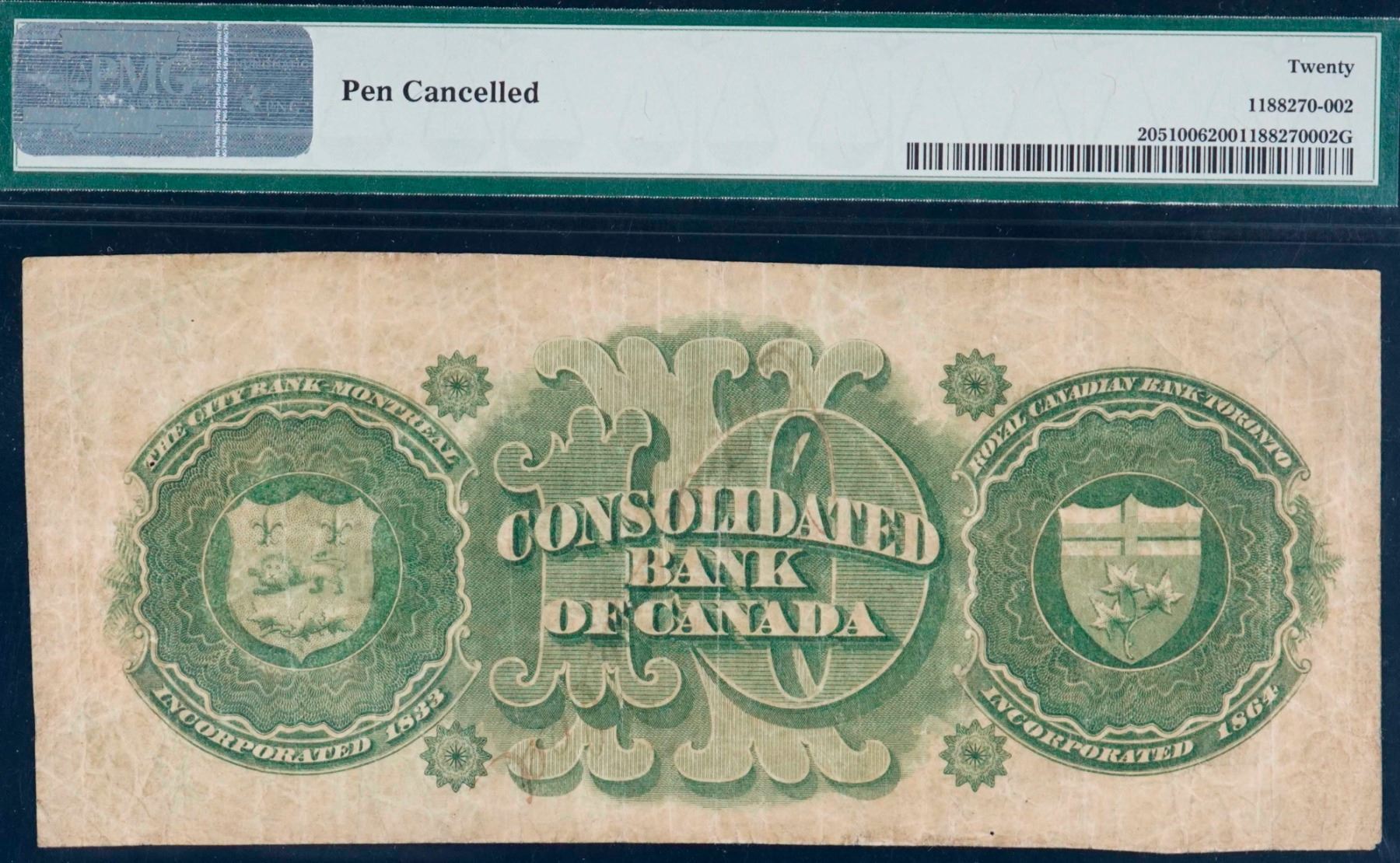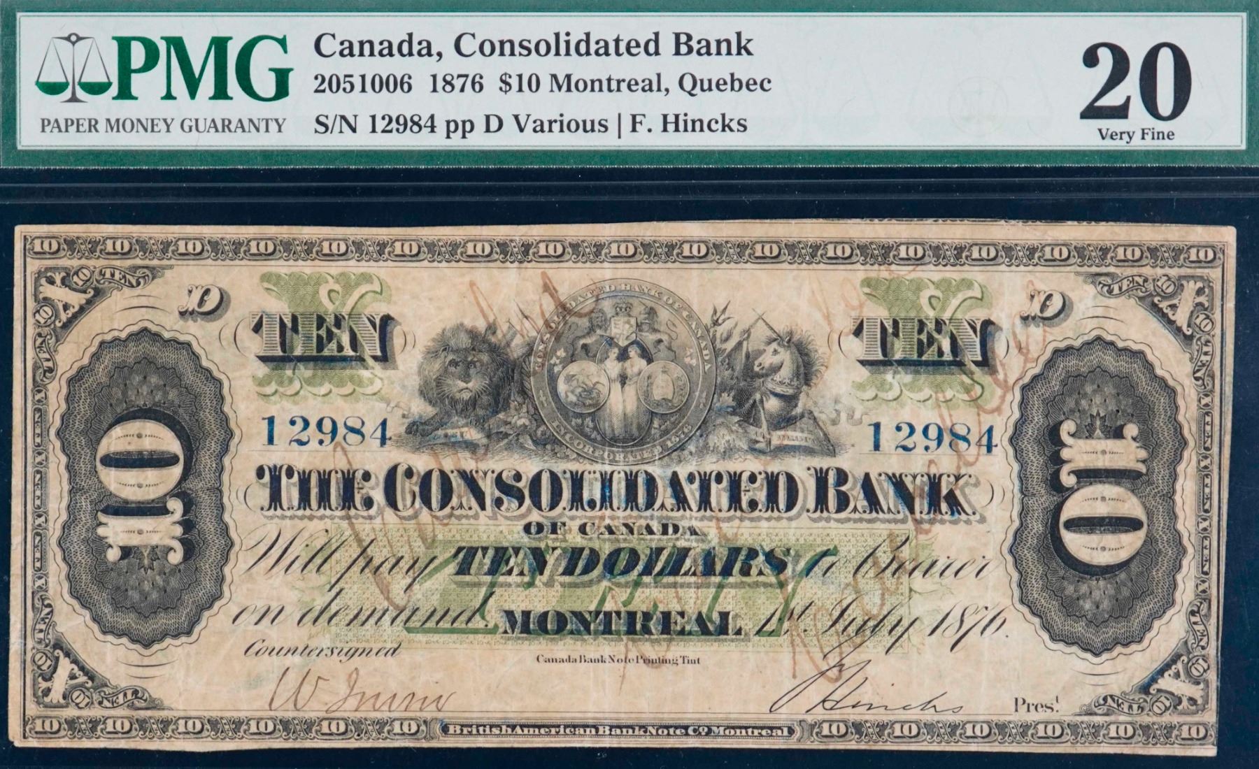 The Consolidated Bank of Canada 1876 $10 #129844 CH-205-10-06 PMG Very Fine-20. Not often offered.