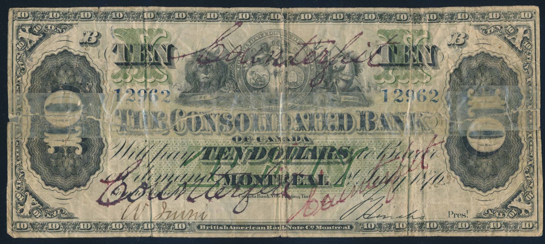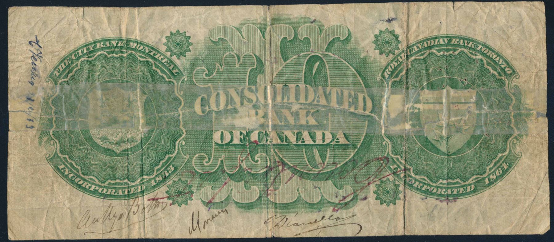 The Consolidated Bank of Canada 1876 $10 Horizontally torn, taped both sides.