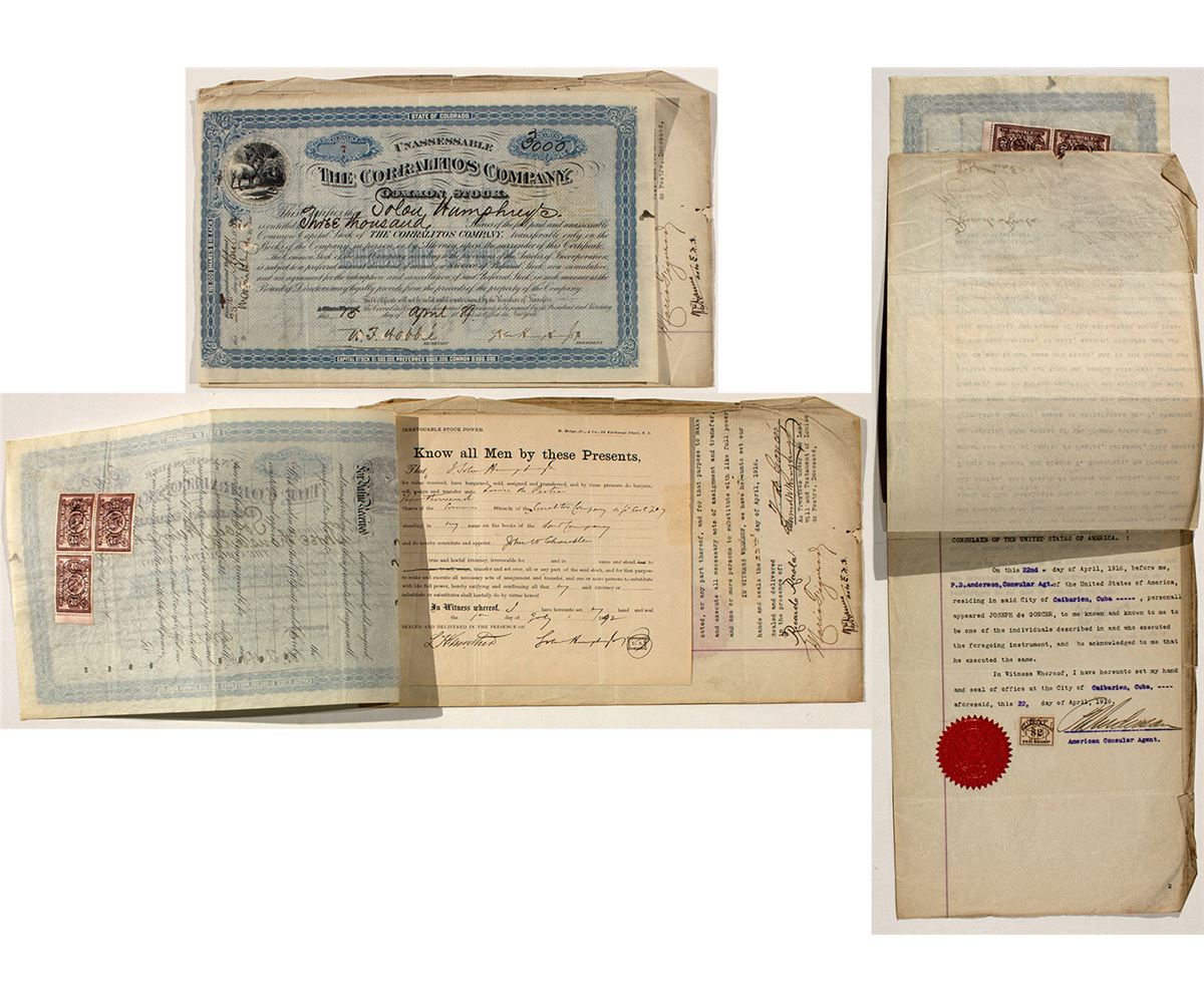 Nice collection of a stock and powers of attorney. Stock is issued to Solou Humphreys in 1889. It is number '7' for 3,000 shares. Signed by WF Hobbie and John Humphreys. Cancelled. Three New York stock transfer stamps on back. Includes a sales slip and Power of Attorney for the estate of Louise de Pester. This includes an unusual $2 American Consular Stamp and red seal of the American Consular Agency in Cuba. The Corralitos Company operated mining and ranching interests in the northern part of the state of Chihuahua, Mexico, during the late nineteenth and early twentieth centuries. We have not seen this stock before and a check of other sources shows this rare early issue.