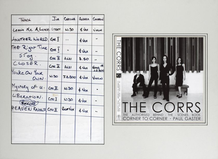 An extremely early 1992 set list with nine songs and instructions for Jim, Caroline, Andrea and Sharon. Used during one of their early showcase performances at the Waterfront Cafe. Attractively framed alongside an enlarged version of the book cover The Corrs: Corner to Corner" by Paul Gaster."