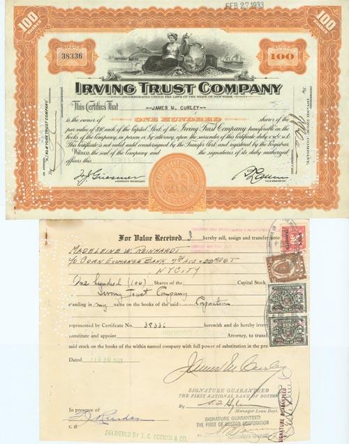 James Curley. DS. 2pp. 10 3/4" x 7". New York. 1933. A Irving Trust Company stock issed to and signed by Boston Mayor James Curley on a separate receipt. The stock has been punch cancelled, though the separate receipt has not. Both pieces are in fine condition.