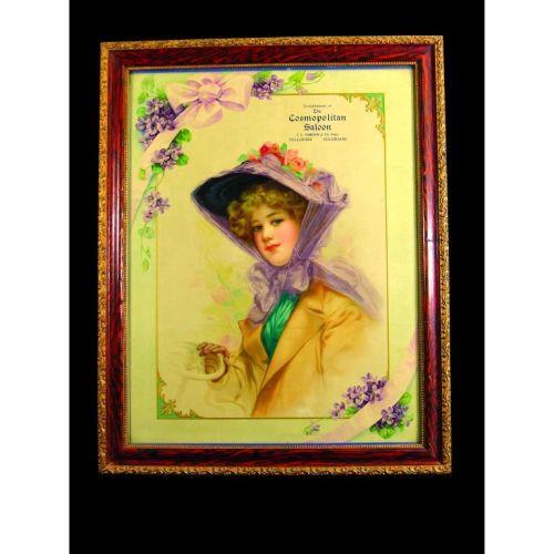 The Cosmopolitan Saloon Embossed Paper Sign, Telluride, CO, small nail holes at the bottom otherwise excellent condition, Framed Under Glass, image is 15 x 19 1/2 inches.