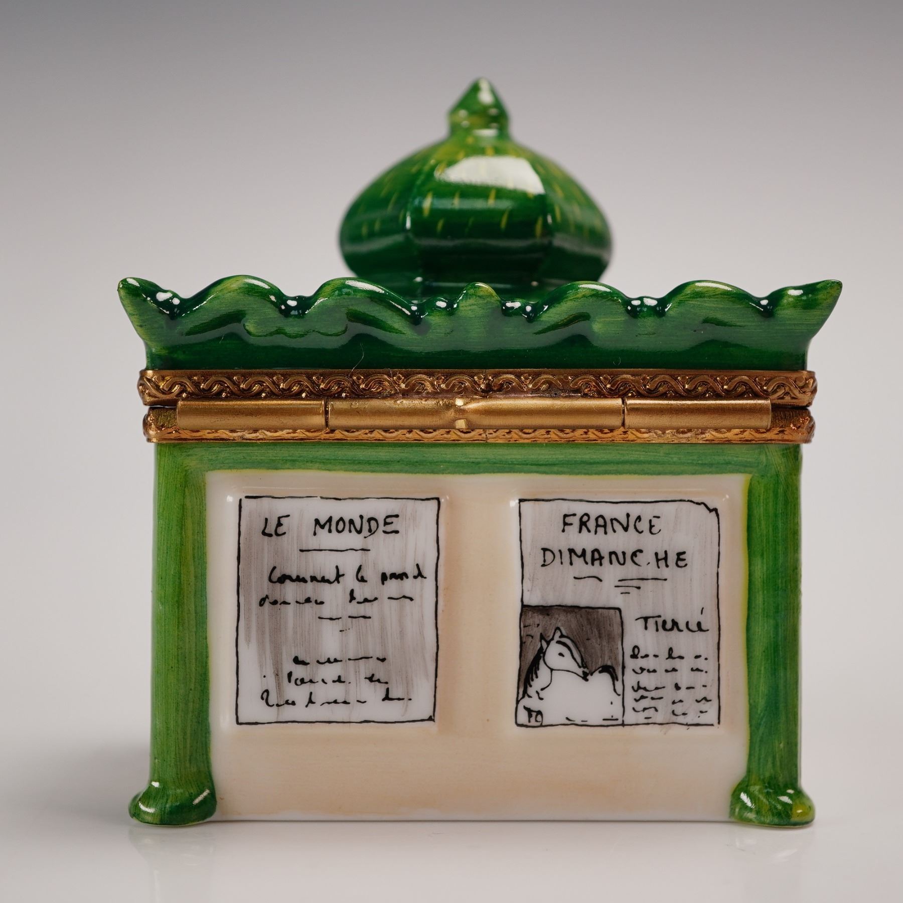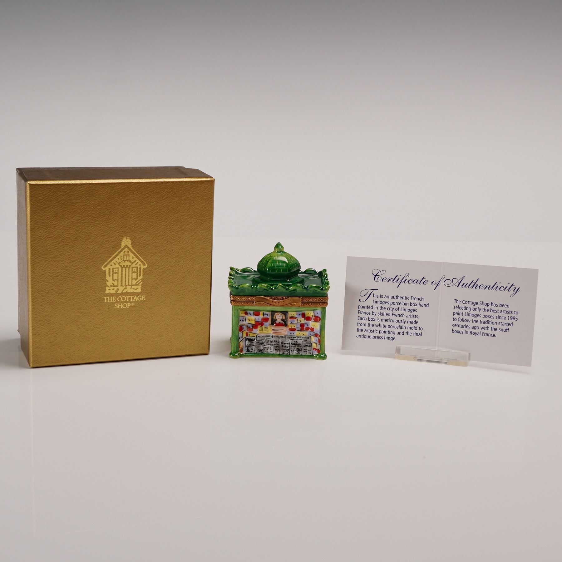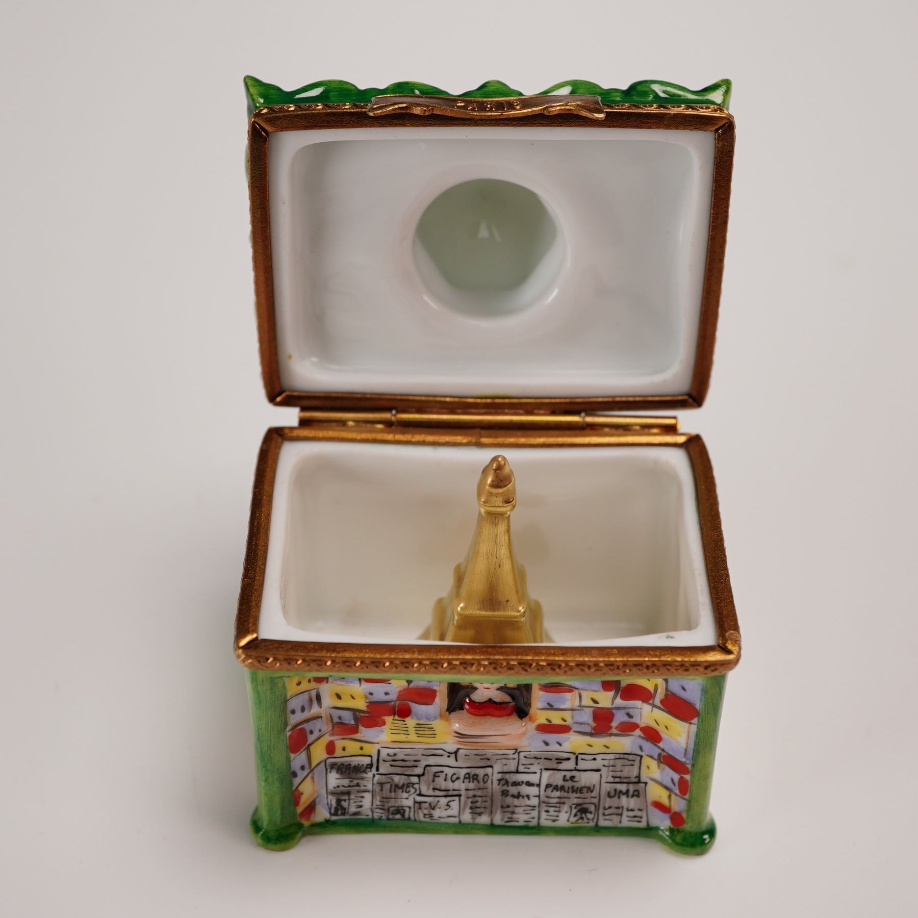 Charming French Limoges porcelain trinket box from The Cottage Shop, finely hand painted in the form of a Parisian newsstand. The vivid design depicts a vendor surrounded by colorful stacks of newspapers, with front headlines including Le Figaro, Le Parisien, France Dimanche, and others, while the sides feature Le Moulin Rouge and theatre posters. The hinged lid opens to reveal a miniature gilt Eiffel Tower inside, with an ornate brass clasp marked "Paris." Base marked Peint Main G.V. Limoges France. Includes original gold Cottage Shop box and certificate of authenticity.