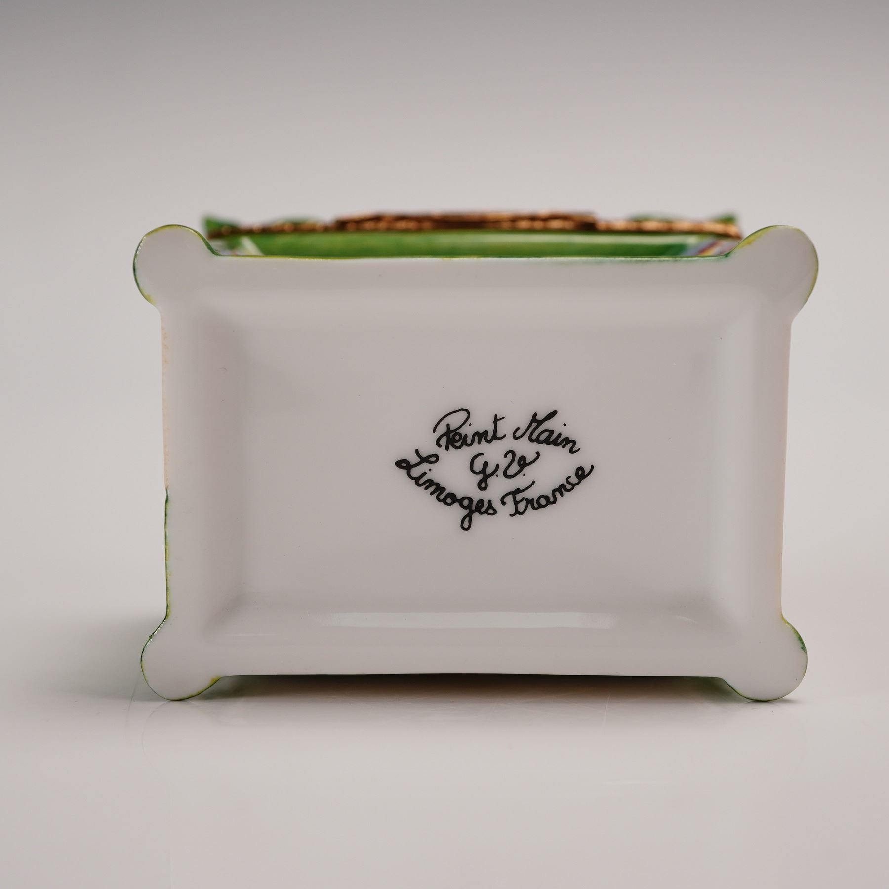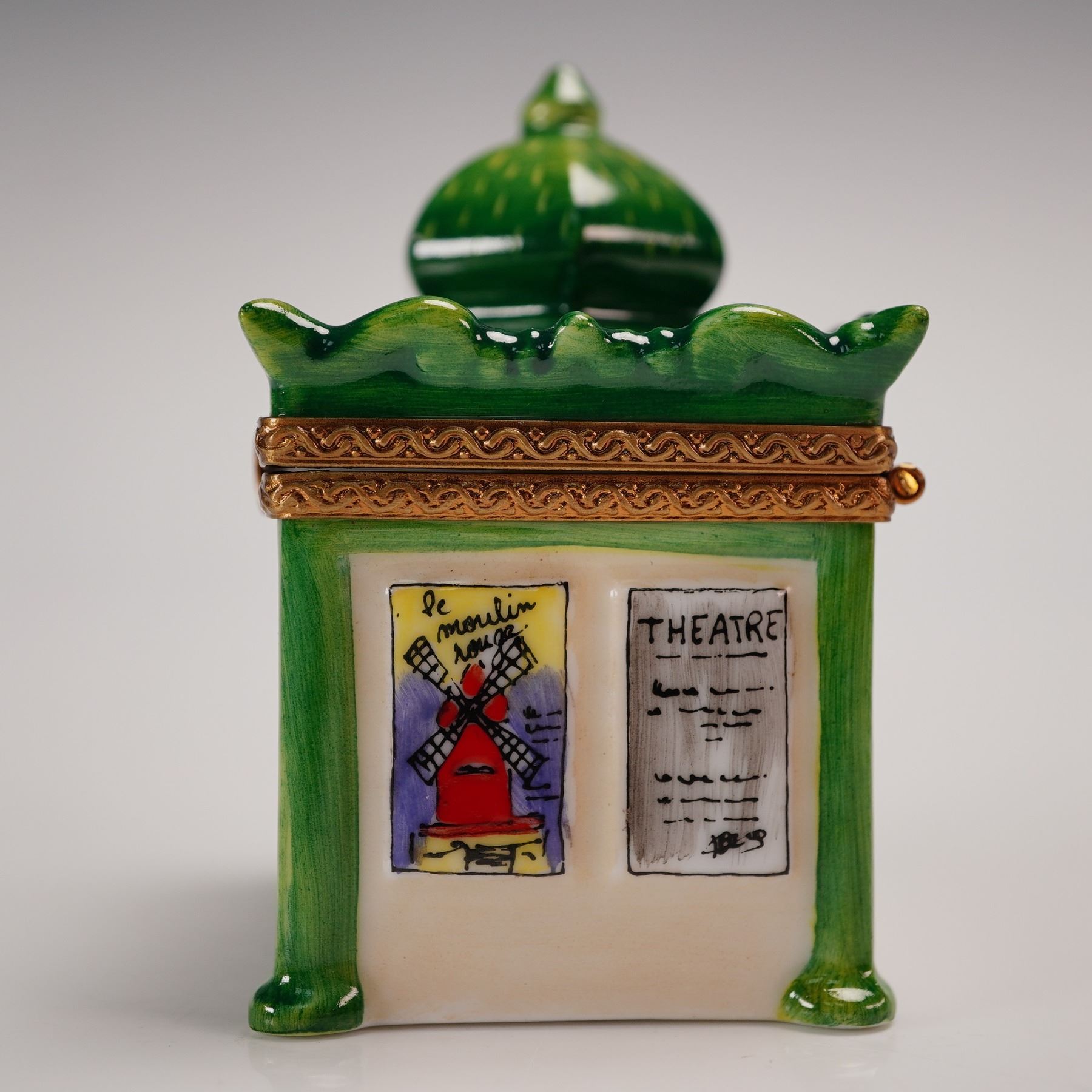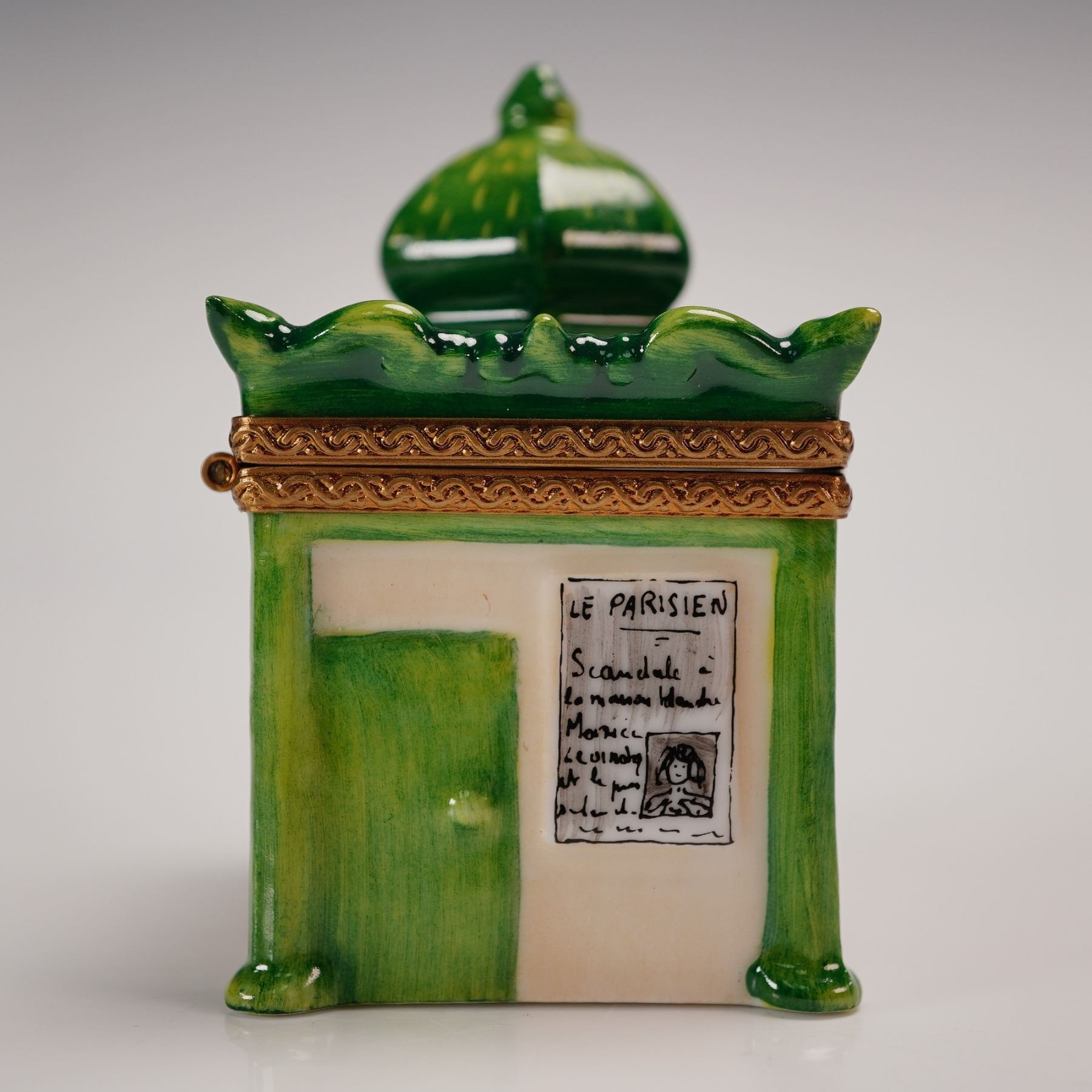 Charming French Limoges porcelain trinket box from The Cottage Shop, finely hand painted in the form of a Parisian newsstand. The vivid design depicts a vendor surrounded by colorful stacks of newspapers, with front headlines including Le Figaro, Le Parisien, France Dimanche, and others, while the sides feature Le Moulin Rouge and theatre posters. The hinged lid opens to reveal a miniature gilt Eiffel Tower inside, with an ornate brass clasp marked "Paris." Base marked Peint Main G.V. Limoges France. Includes original gold Cottage Shop box and certificate of authenticity.
