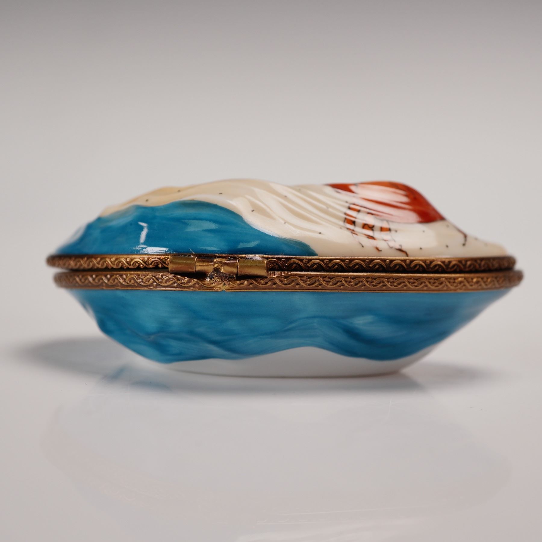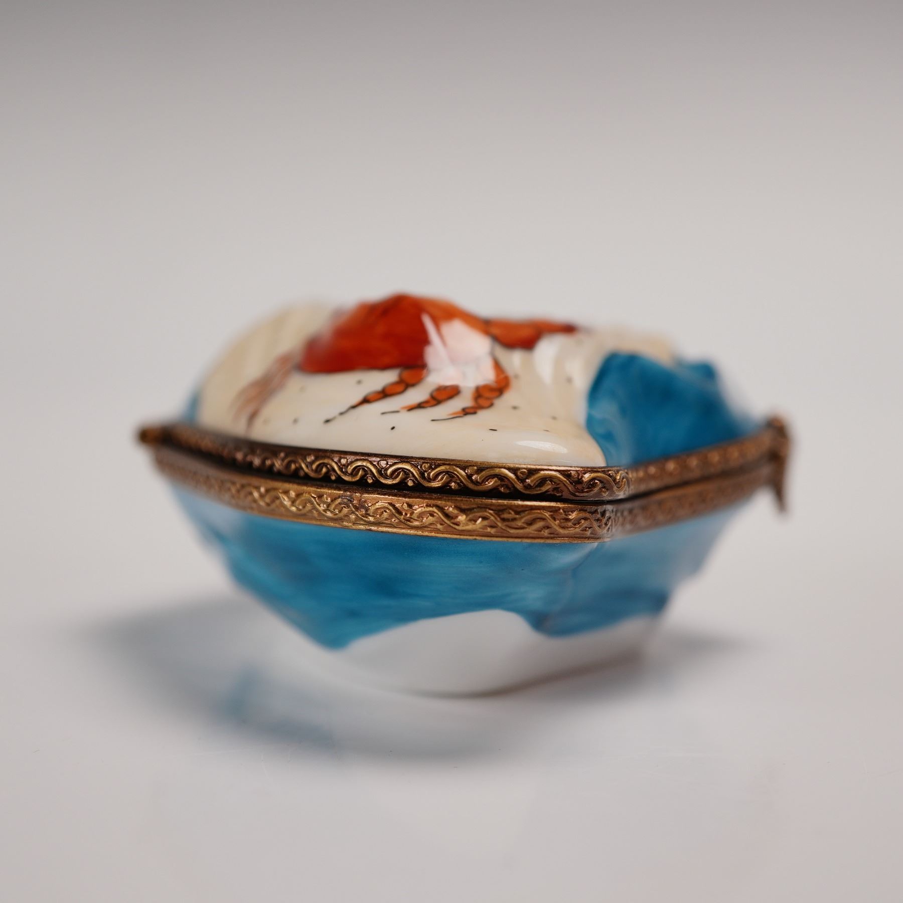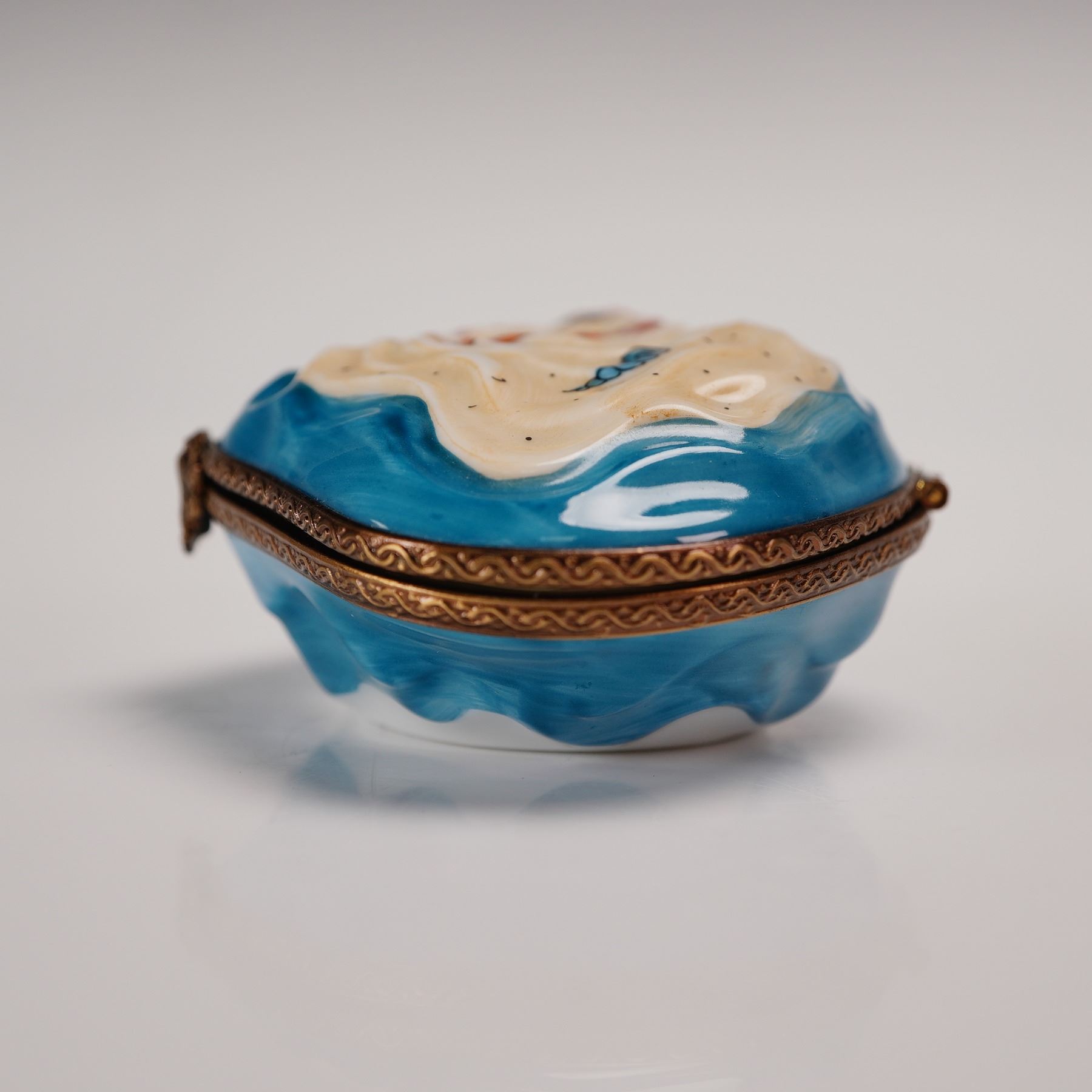 Hand-painted Limoges France porcelain keepsake box in the form of an astronaut standing on a marbled surface, complete with detailed space suit and American flag patch. The hinged box opens to reveal a whimsical painted alien inside. Marked on base Limoges France Peint Main. Includes original The Cottage Shop gold box.