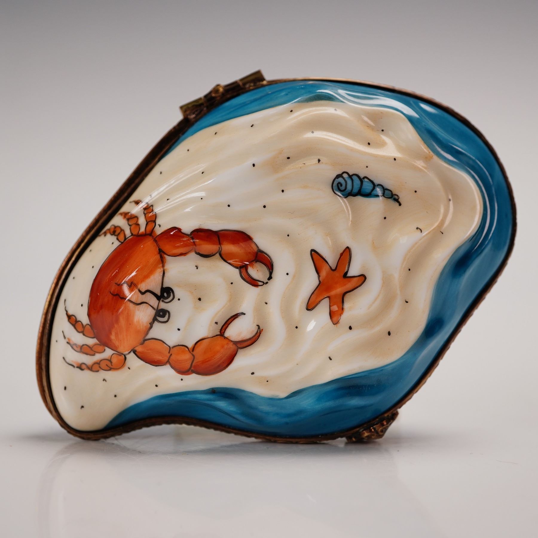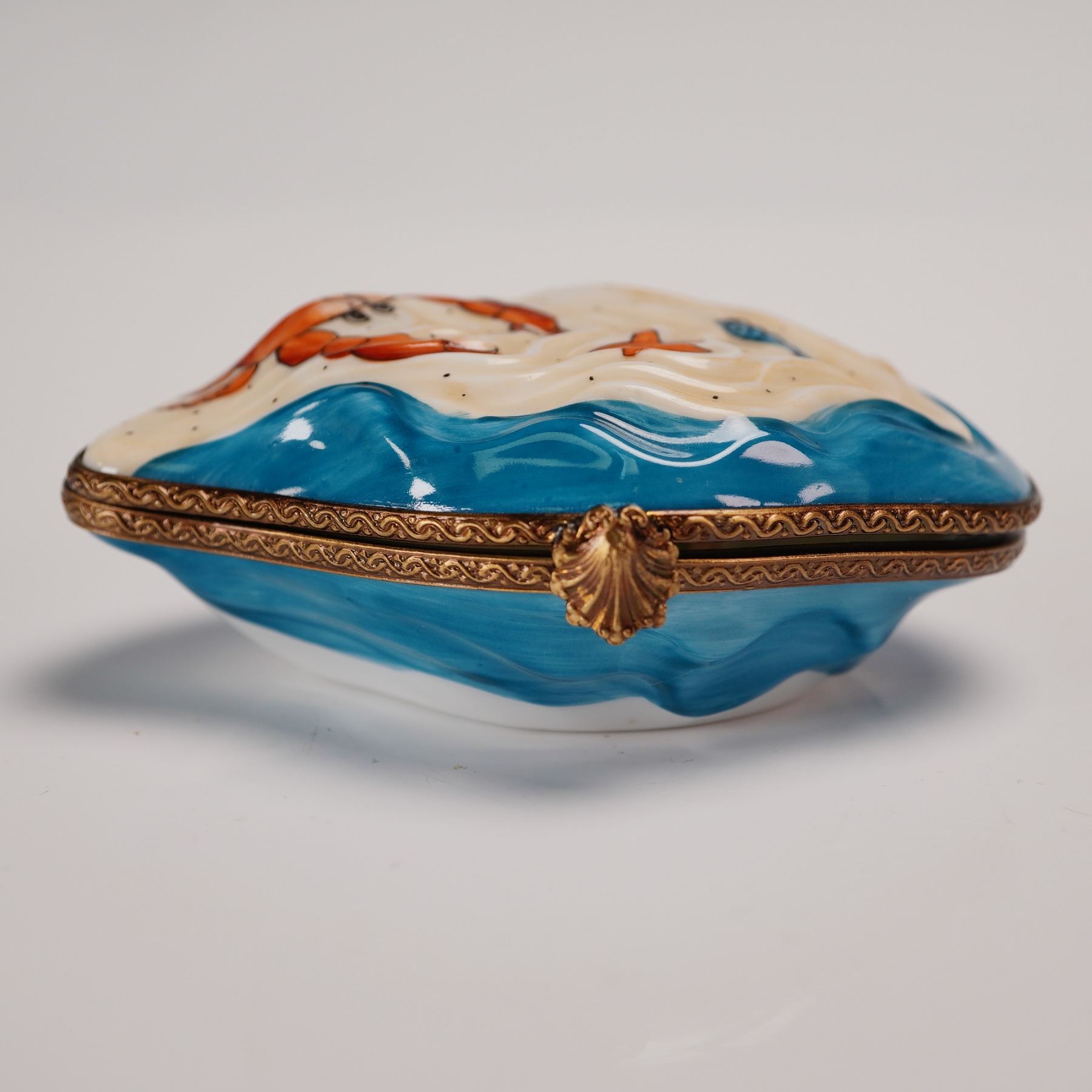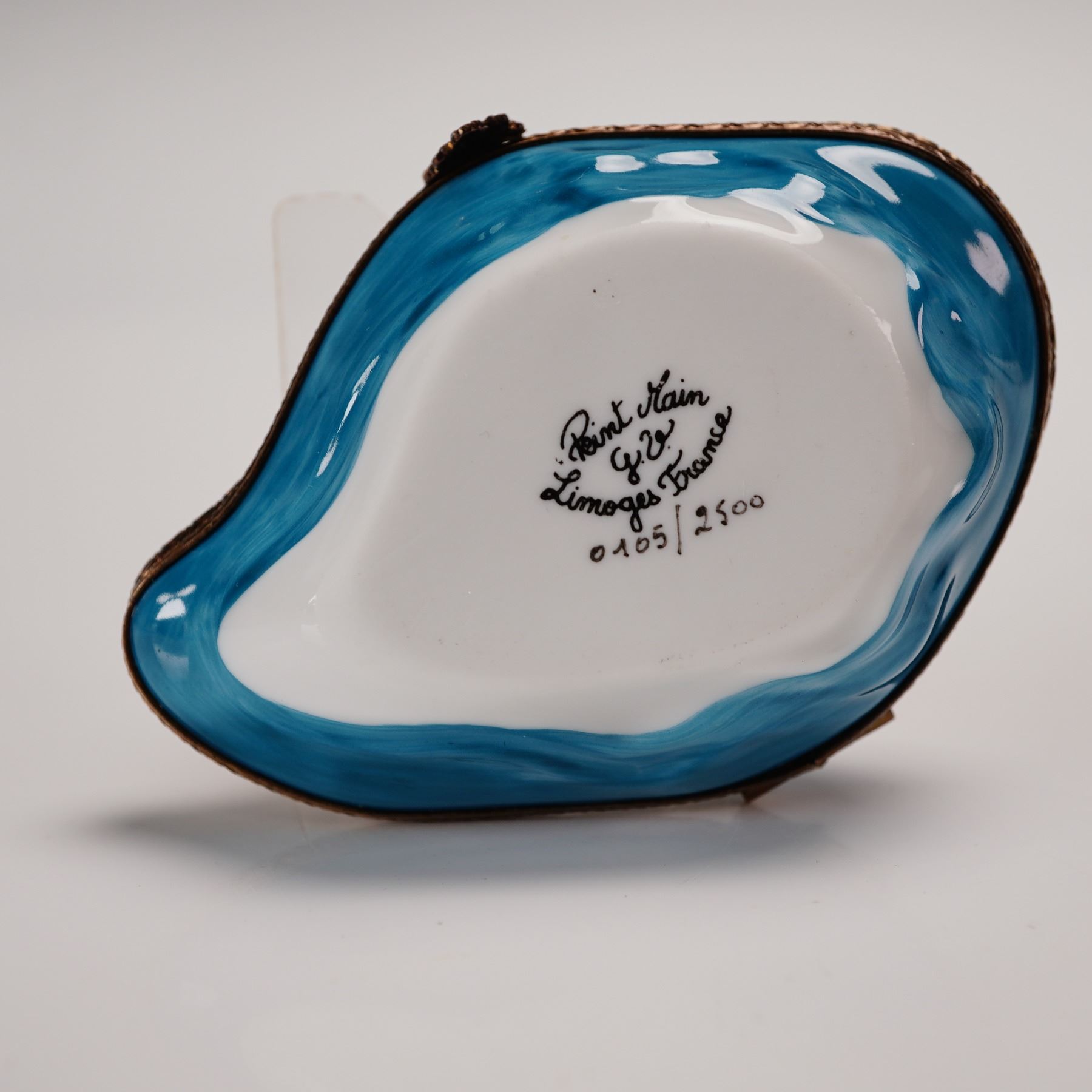 Hand-painted Limoges France porcelain keepsake box in the form of an astronaut standing on a marbled surface, complete with detailed space suit and American flag patch. The hinged box opens to reveal a whimsical painted alien inside. Marked on base Limoges France Peint Main. Includes original The Cottage Shop gold box.