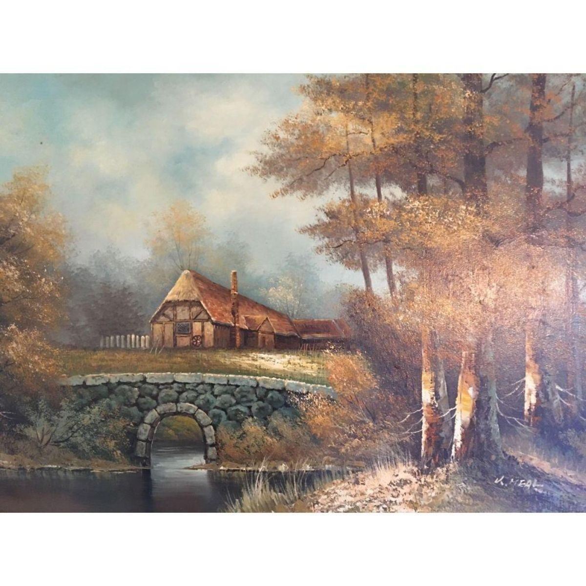 Original Oil on Canvas in custom frame. Painted by K. Neal, this scene depicts a rustic alpine cottage by a stone bridge.Â