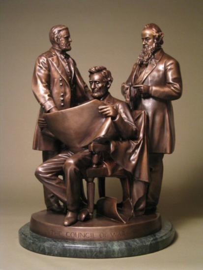 This masterwork depicts President Abraham Lincoln, General Ulysses S. Grant and Secretary of War Edwin Stanton reviewing Grant's plans of operation for the Army of the Potomac. Rogers captures Stanton wiping his spectacles as Lincoln deeply contemplates the mapped plan and Grant looks on.