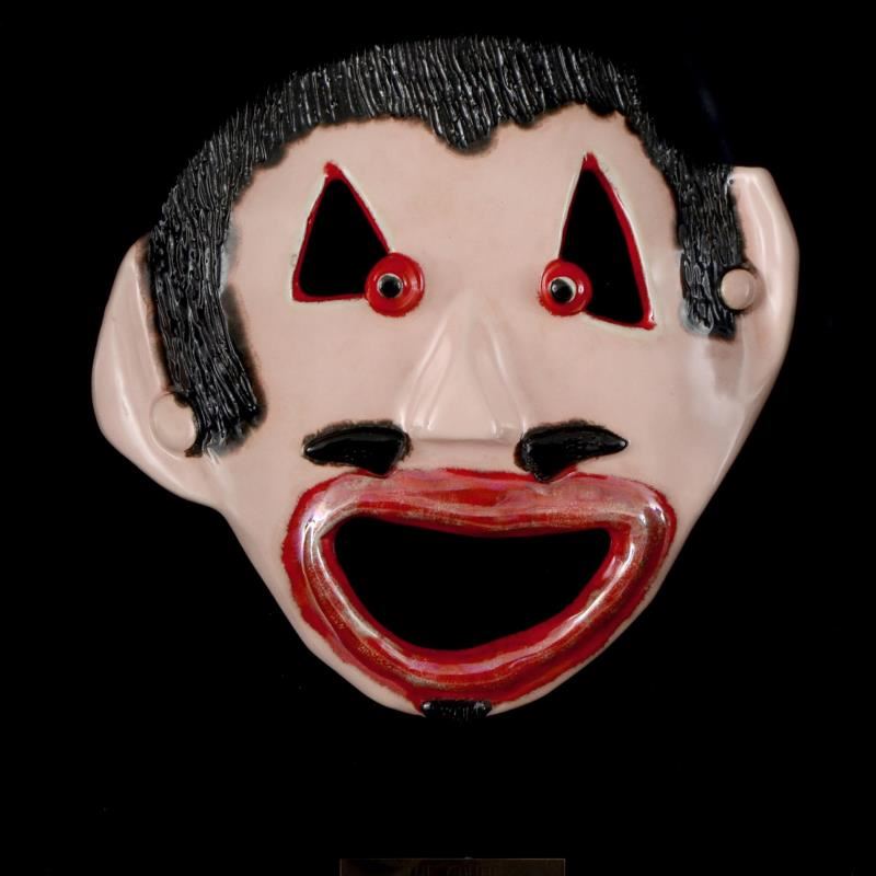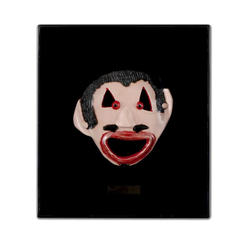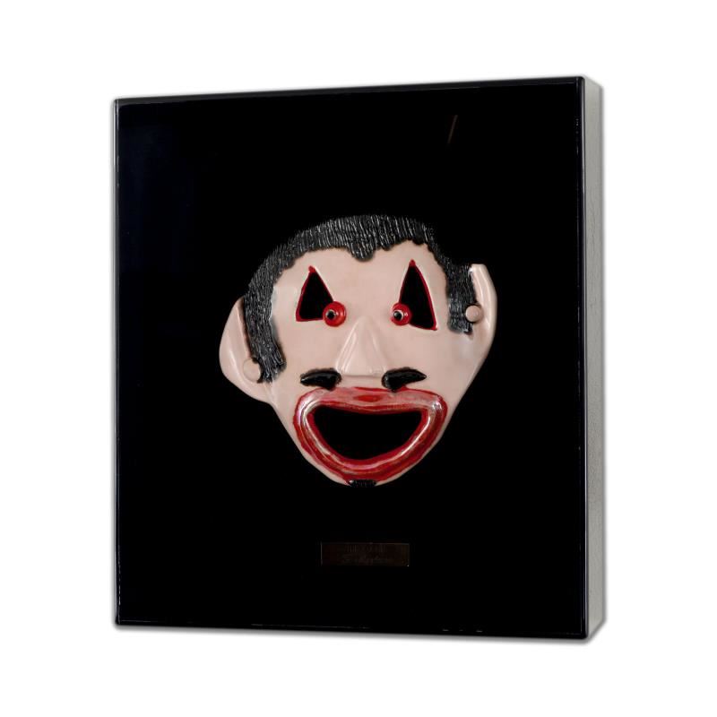 "The Count" is an original ceramic mask sculpture by George Marlowe. This piece comes suspended and encased in a custom-made Lucite display with signed metallic name plate. Includes Certificate of Authenticity. Measures approximately 17.5" x 15.5" x 4.5" (frame), 9" x 9" (mask).
