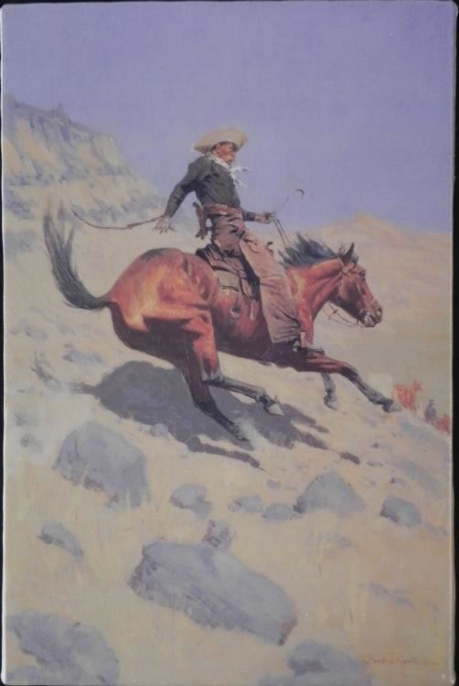 The Cowboy Frederic Remington Print On Canvas Art Title: "The Cowboy" Artist: Frederic S. Remington Medium: unsigned offset lithograph print transferred onto canvas: stretched on boardSize: 7 3/4" x 12"Condition: Excellent Biography: This painting was one of a series of four by Remington that was reproduced in the October 1902 issue of Scribner's Magazine under the general title "Western Types." Besides the cowboy, the other paintings depicted a scout, a "half-breed," and a cavalryman. The paintings were also reproduced as separate prints, and they all proved to be popular with the public. The painting of The Cowboy shows Remington's new awareness of color; harmonious tones of dusty yellow, light blue, and pale lavender in the desert landscape surround the rider and his horse. The story is told that John Howard, a boyhood friend of Remington's, greatly admired the painting in the artist's studio and asked its price. Although Remington quoted a far higher price than anticipated, Howard reluctantly agreed to write a check for the amount. Months passed without the check clearing the bank, and Howard found himself having to remind Remington several times about their transaction. One evening, as the two men were sitting together after a dinner at Remington's house, the artist used a piece of paper to light their cigars. Once that was done, Remington informed his friend that the piece of paper was his check and the transaction had just been completed. The rise of the cowboy as the romantic hero of the American West began shortly after the Civil War, and Remington was one of the principal artists to play a part in that development. One of the cowboy's most vocal supporters was the artist's friend Theodore Roosevelt; the cowboy in Remington's painting reflects what Roosevelt had to say about the cowboy as hero. In a series of articles illustrated by Remington on his experiences as a ranchman in the Dakota Territory published in Century Magazine in 1888-89, Roosevelt described the cowboys he knew as "hardy and self-reliant as any men who ever breathed." He praised the cowboy's strength of character, which included a "frank and simple" approach to life, a "whole-souled hospitality" to others, and an air of "grave courtesy" to outsiders. By the time the writer Owen Wister published his novel The Virginian in 1902, such traits were embedded in the central character, thus beginning a long line of western heroes that would later appear in fiction and film. Not surprisingly, Wister dedicated his novel to Roosevelt. Found from: http://www.cartermuseum.org/artworks/2586