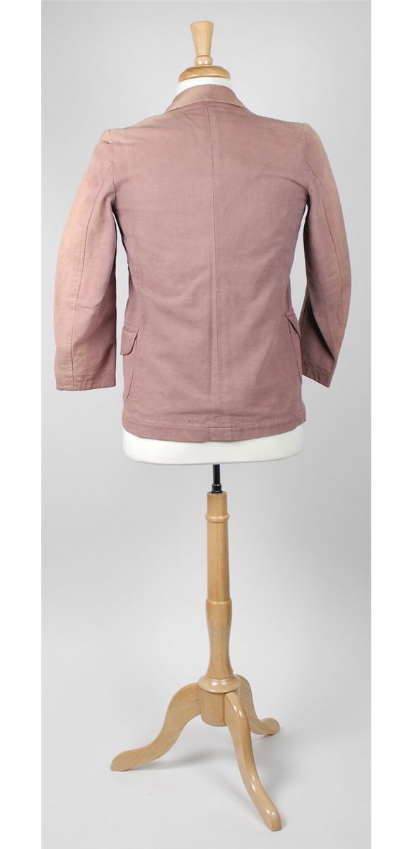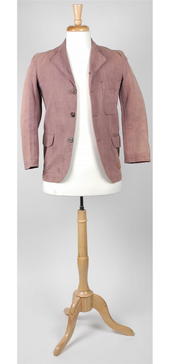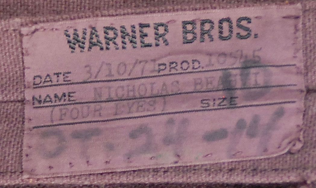 Coat worn by Nicholas Beauvy’s character Four Eyes in the 1972 film The Cowboys with John Wayne. Light purple long-sleeve jacket has a three-button front and a Warner Bros. costume tag sewn to the inside with Beauvy’s name typed on the second line, and dated March 10, 1971. In fine condition.