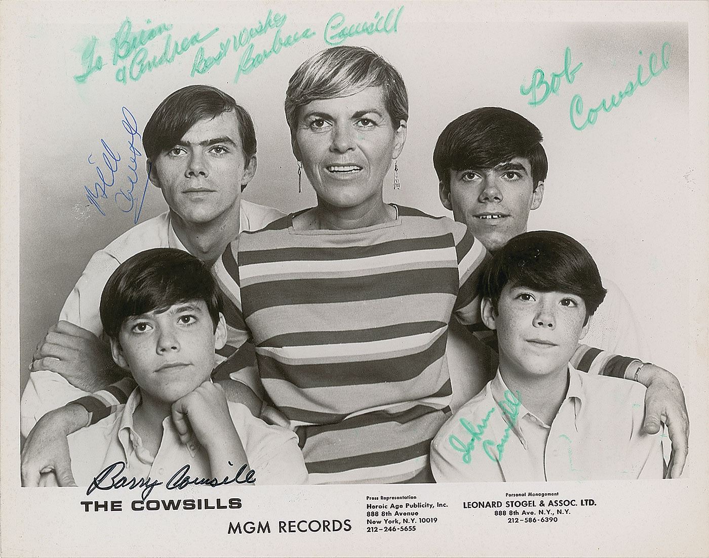 Glossy 10 x 8 MGM Records publicity photo of The Cowsills, signed and inscribed in felt tip and ballpoint, "To Brian & Andrew, Best wishes, Barbara Cowsill," "Bob Cowsill," "John Cowsill," "Barry Cowsill," and "Bill Cowsill.” In fine condition, with some brushing to Barbara's inscription.