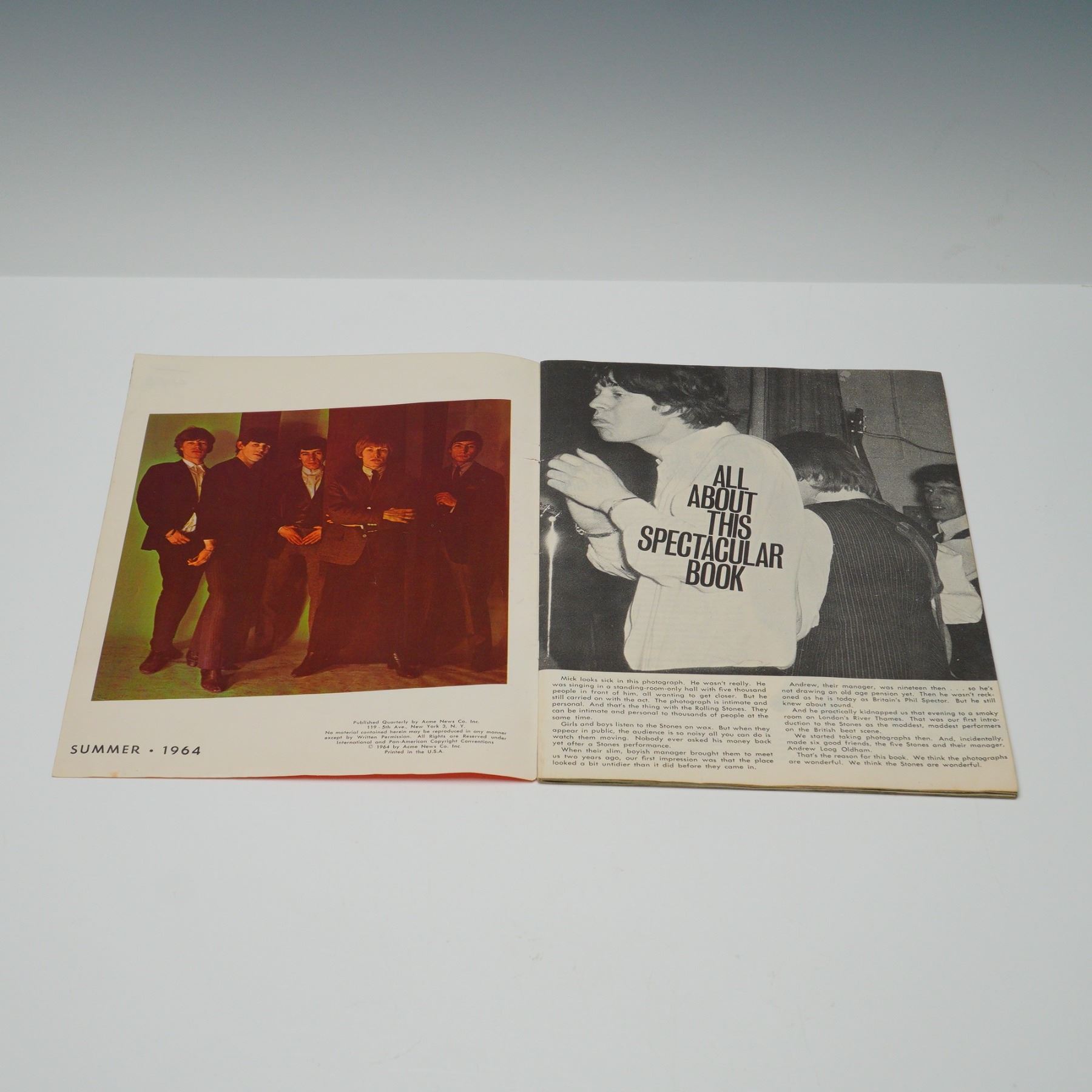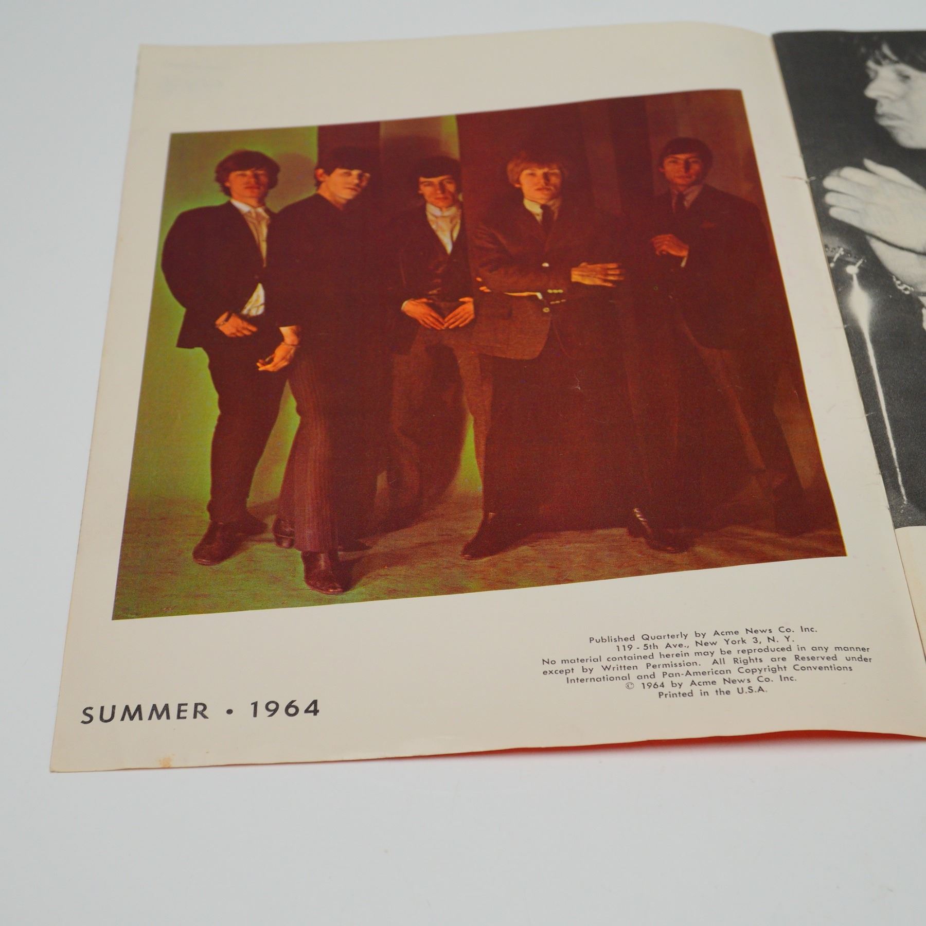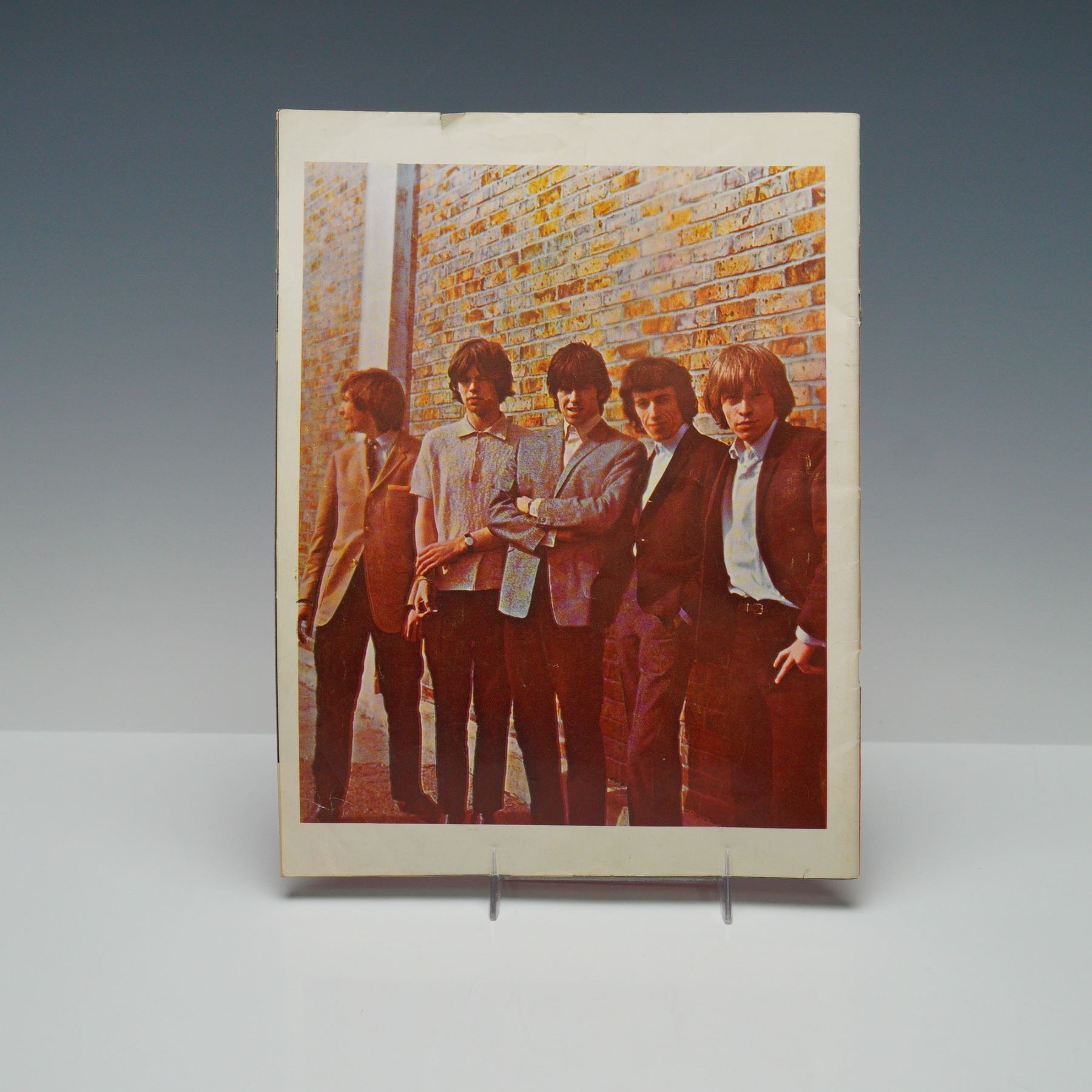 This listing features The Crazy World of England's Rolling Stones booklet, published in Summer 1964. The booklet includes 7 brilliant color photos of the Rolling Stones in various poses, ideal for framing. The cover features a vibrant image of the band, and the booklet provides insight into their rise to fame. This collectible piece captures the early moments of one of rock's most iconic bands. The booklet measures approx. 8"L x 10.75"H.