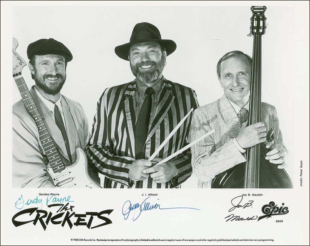 Satin-finish 10 x 8 Epic Records publicity photo, signed in green felt tip by Gordon Payne, in blue felt tip by Jerry Allison, and in black felt tip by Joe B. Mauldin. In fine condition.