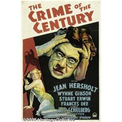 <B>The Crime of the Century (Paramount, 1933)</B></I> One Sheet (27" X 41") Style A. Ah, how times changed? When the film was made in 1933, the "crime of the century" refers to the theft of $100,000. Admittedly, that was a lot of money in depression era America. Otherwise, this Jean Hersholt film was a remarkable detective murder mystery, where, in a truly unusual plot twist for that time, the detective was the murderer.The beautiful stone-litho graphics on the poster shows Hersholt and a cowering young Frances Dee, who plays his daughter in the film. The poster exhibits some minor wear in the lower center point and to the border. The lower left corner has been torn off within the border and some brown paper tape is on the reverse behind each corner. Fine/Very Fine.