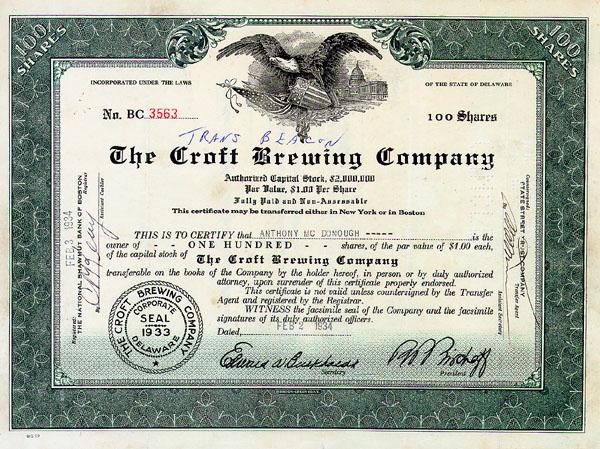 1934, Delaware. Stock certificate for 100 shares. Green/Black. Vignette of top center of eagle with spread wings holding shield, flag and arrows. Perferation cancelled.
