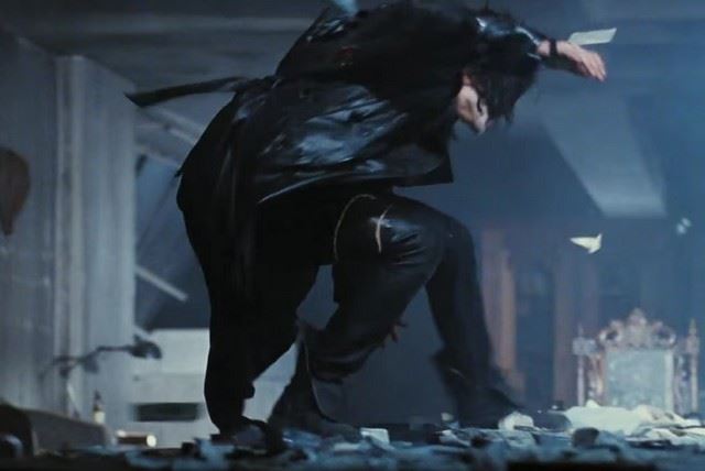 From the infamous feature film The Crow (1994) is Eric Draven's (Brandon Lee) hero black leather double breasted production prototype leather jacket. The jacket was the basis for the final screen worn jacket ultimately worn by Brandon Lee in the film.